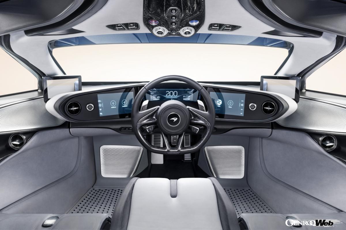 キャビンのセンターにレイアウトされるドライバーズシートからの視界はとても良好だ。コントロールスイッチなどはすべて頭上に集約されており、その操作感も抜群。使用される素材はどれも最高水準のもので、次世代のカーボンファイバー素材を始め、ここでもマクラーレンの先進性を強く感じることができる。