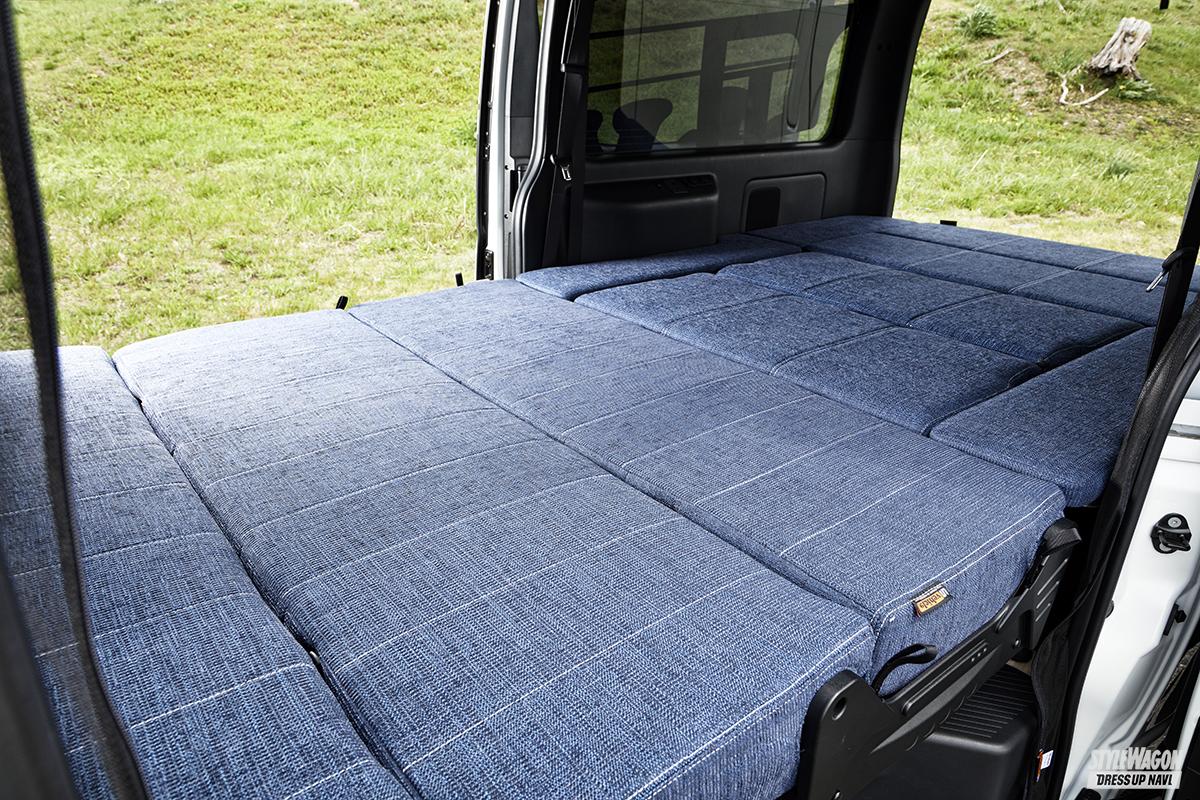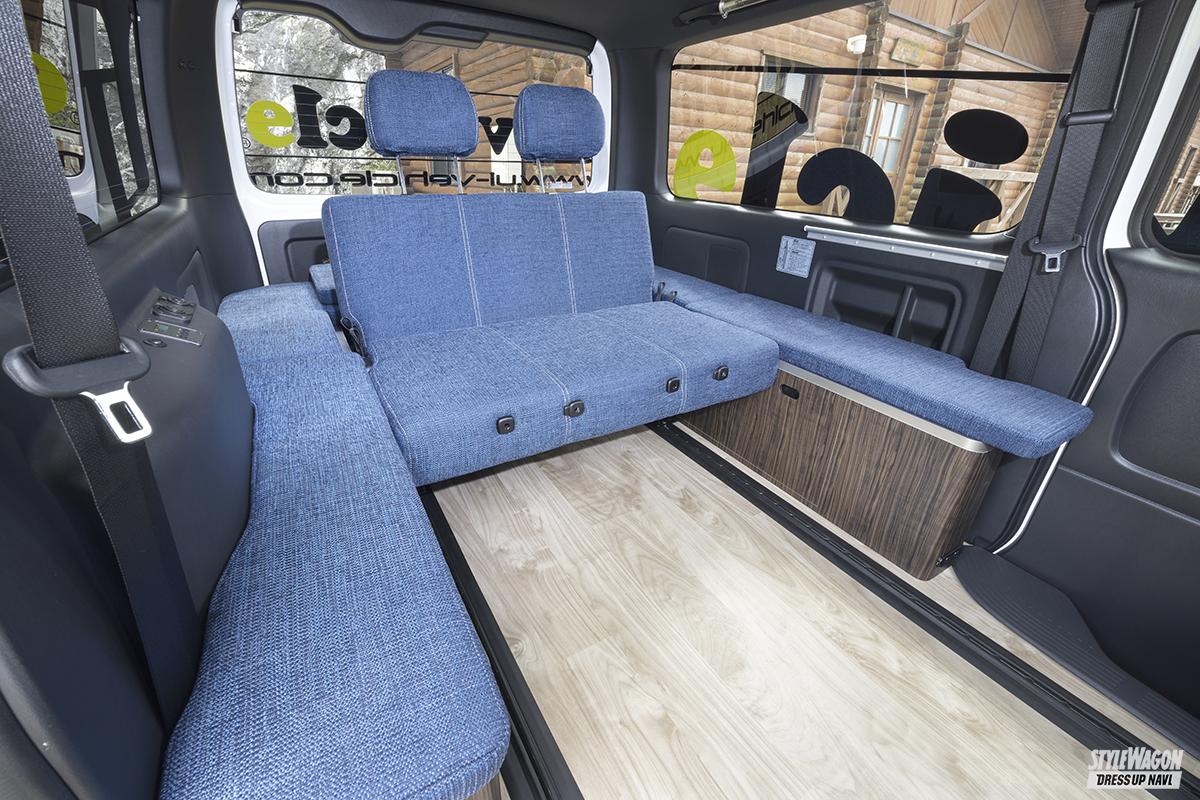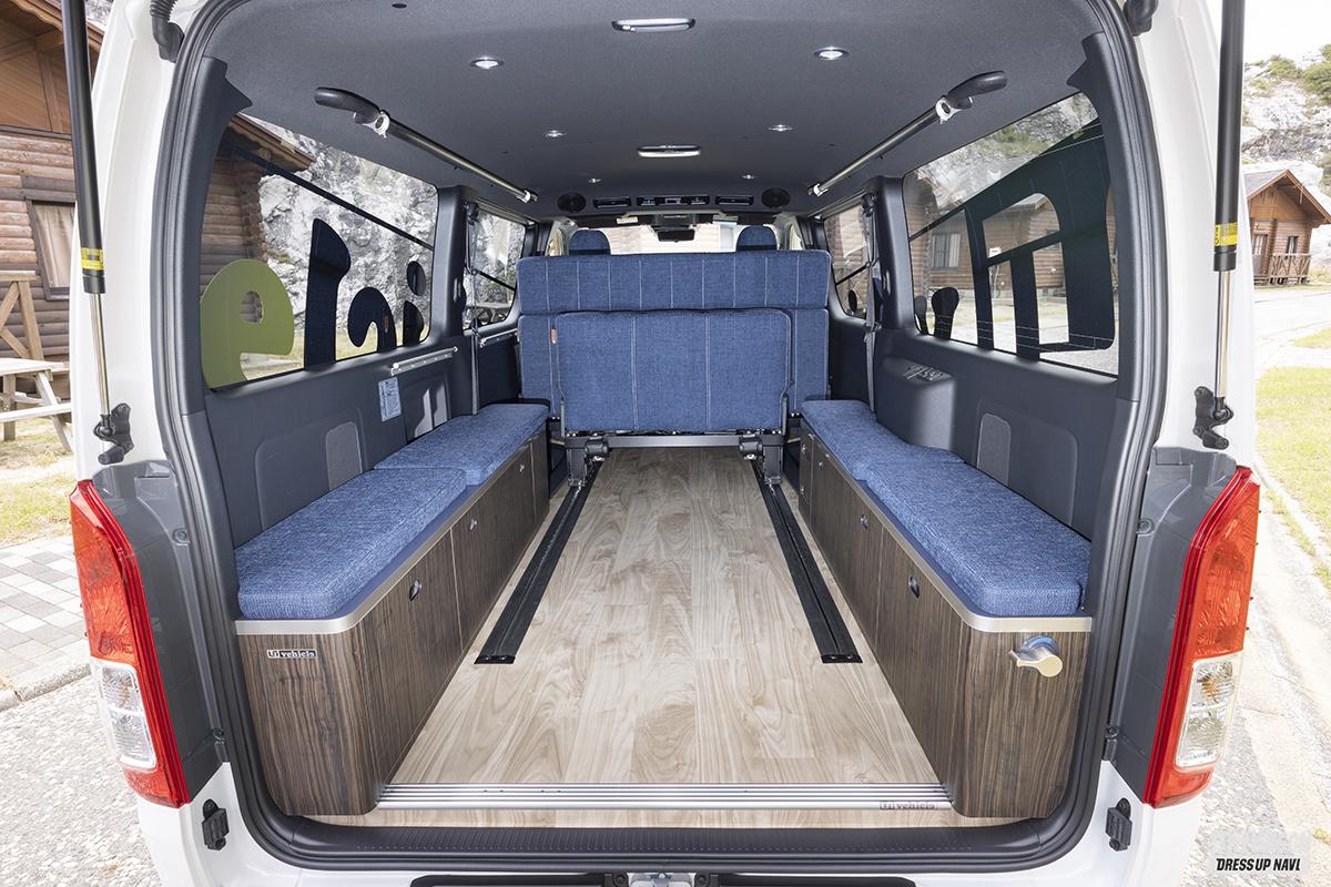 リアスペースは対面シートやフラットベッドなど、自分の使いやすさに合わせてシートアレンジを決定できる。また、ベッド下左右には収納ボックスとして使えるスペースを作りだしており、サブバッテリー等の搭載もできる。さらに真冬は冷気を遮断し暖かく、真夏は熱気を防いで涼しく過ごせる床下断熱処理を施し、快適さを向上させている。遊びにも仕事にも自由自在にスタイルを変えるパッケージ。これは見逃せない。