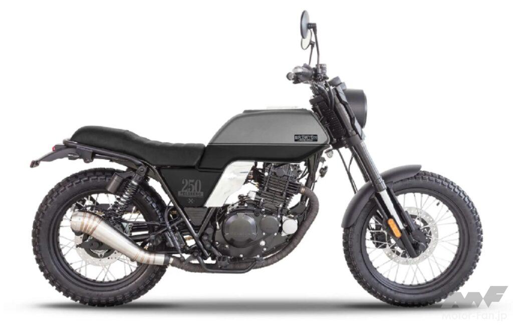 250㏄は145㎏と軽量におさえられたボディを生かし、クラシック・スタイルながらストリートファイターとして車列の先頭を駆け抜けるパフォーマンスを得ている。空冷単気筒エンジンにはEFIが与えられ、前後輪のディスク・ブレーキはABSによって支えられる。2色のボディカラーはいずれも2トーン・デザインとし、丸みを帯びた美しいタンクの造形とともに、Brixtonにしかない所有感をそそる。この仕上がりで希望小売価格704,000円。