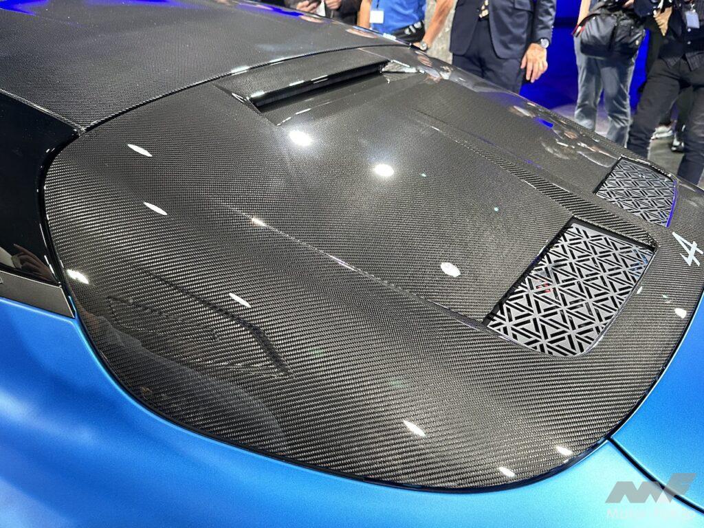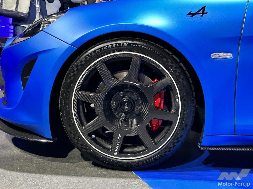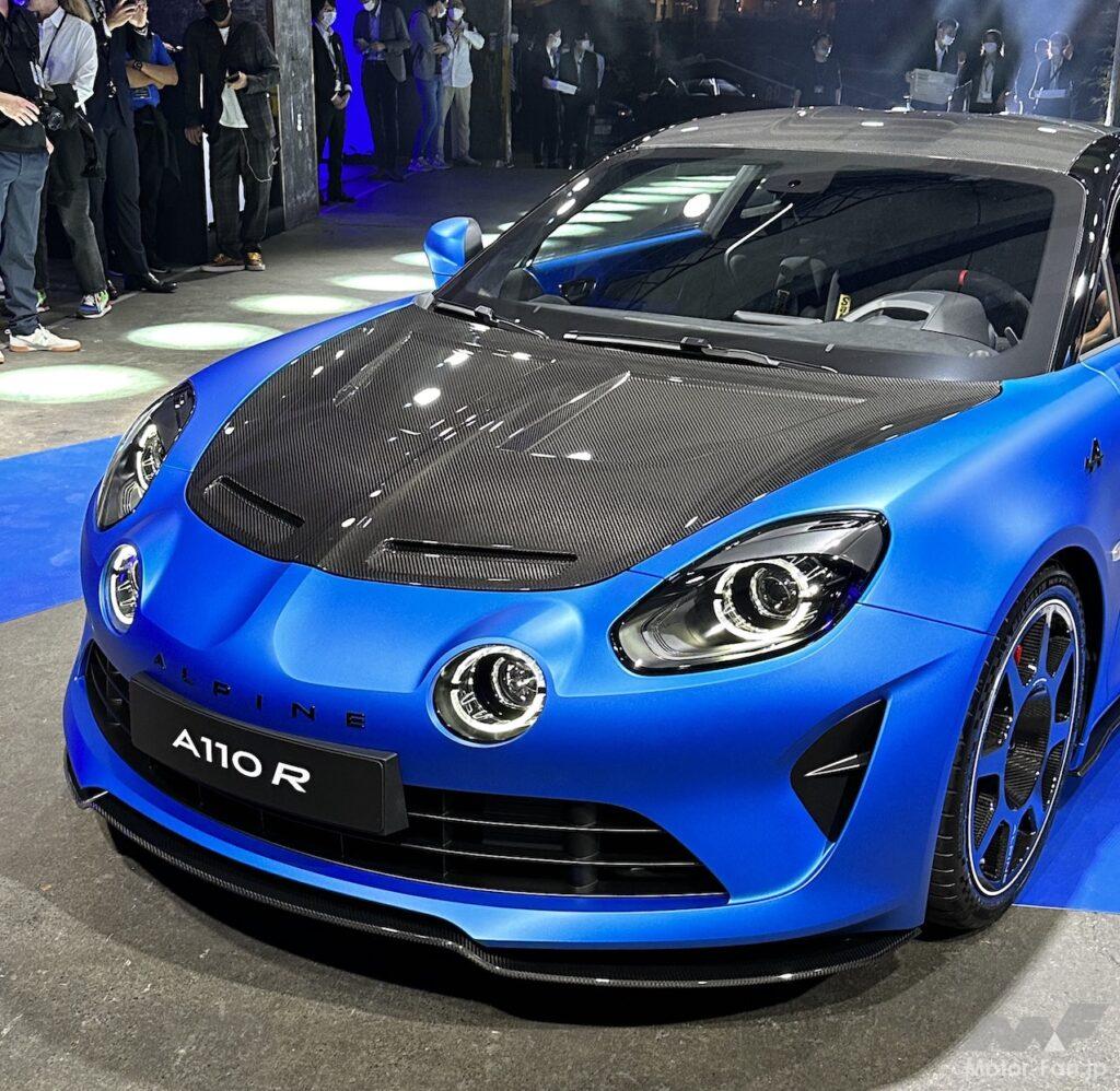 今回新登場した「A110R」は、さらに過激=Radicalなモデルで、カーボンボンネット、カーボンエンジンカバー、フルカーボンホイール、専用カーボンシートなど、軽さと強度に優れたカーボンを使うことでさらなる軽量化を図り、A110Sに対しても、さらに軽量に仕上げている。