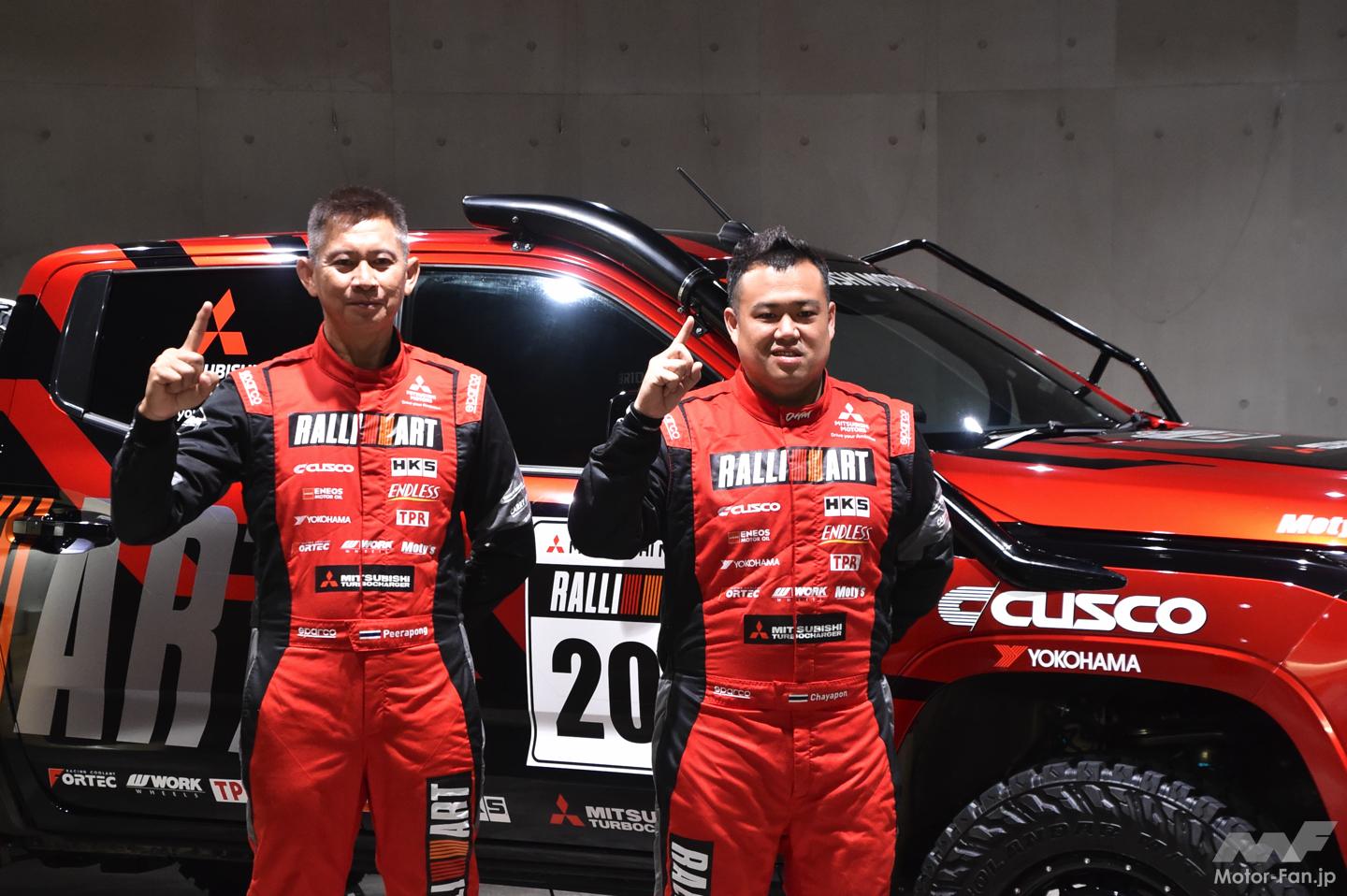 チャヤポン・ヨーター選手は2022年のウィナーであり、2024年も優勝一歩手前まで行ったエースドライバー。子供の頃から三菱自動車のパリダカールラリーやWRCを見て、三菱のラリードライバーを目指したという経歴。昨年惜敗しただけに、今回の三菱のドライバーとして優勝は本当に嬉しいと語った。