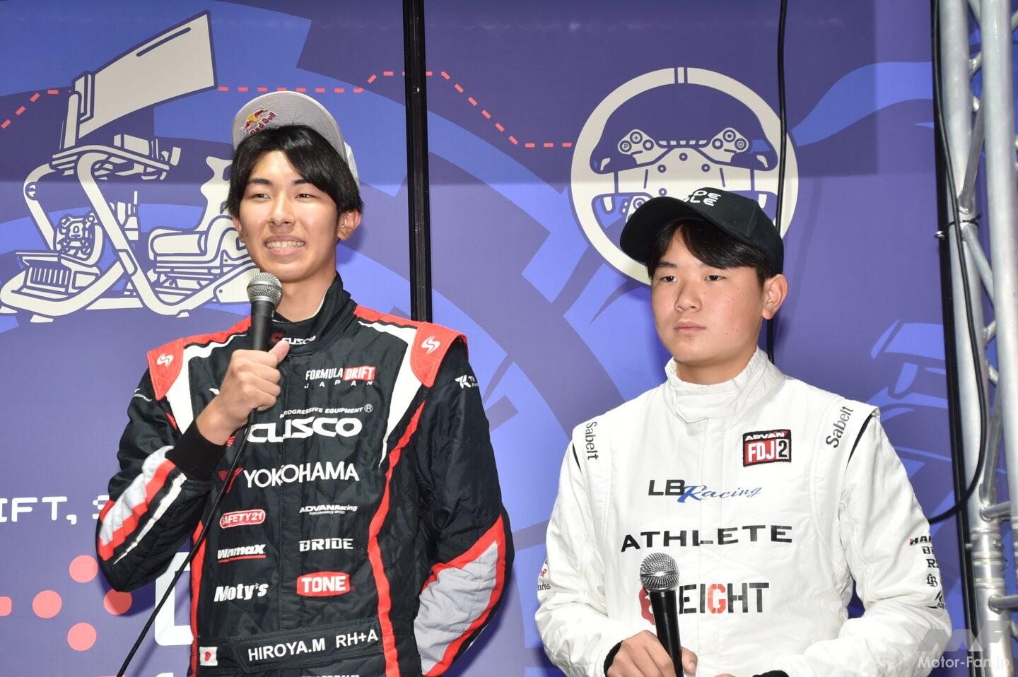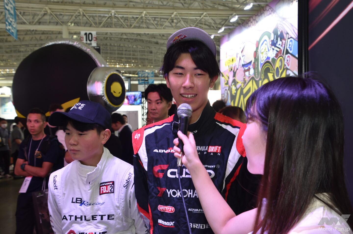 DELEブースのステージイベントとして現役ドライバーのトークセッションも行なわれた。登壇したのはフォーミュラドリフトUSAで最年少優勝(15歳)を成し遂げた箕輪大也選手と、フォーミュラドリフトジャパン2に参戦するHINATO選手。箕輪選手が16歳、HINATO選手は14歳という、まさに”ヤング”ドライバーだ。