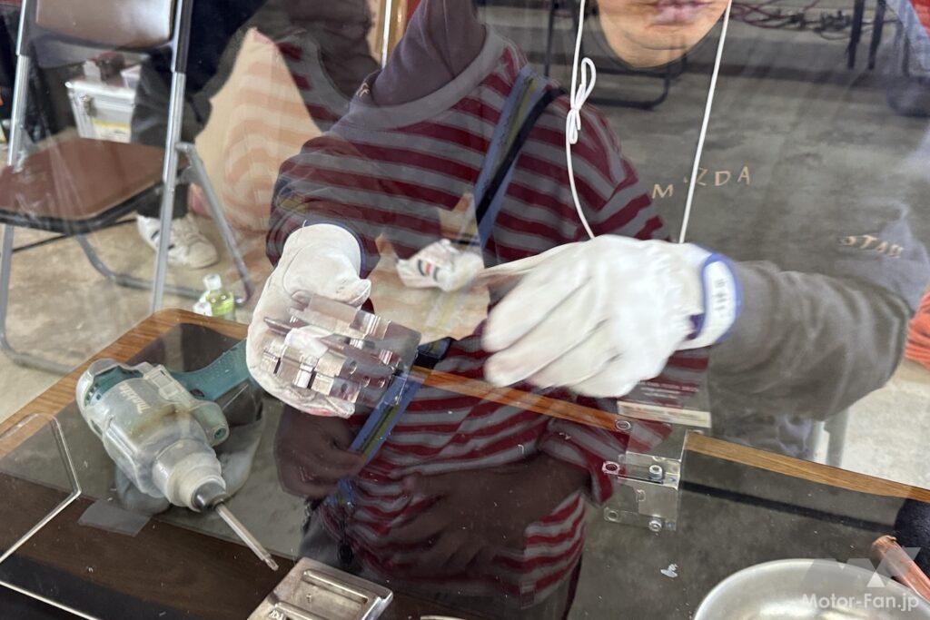 その一例として、「圧縮着火で火がつくエンジンの秘密」と題したブースをご紹介しよう。ここでは底に脱脂綿が入れられた細い筒が用意されており、その筒に棒を差し込んで勢いよく押し込むと、筒の中の温度が上がって脱脂綿に火が付く、というデモンストレーションを実演できる。ガソリンエンジンによる圧縮着火を世界で初めて実用化したマツダならでは、のコンテンツだ。