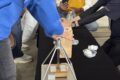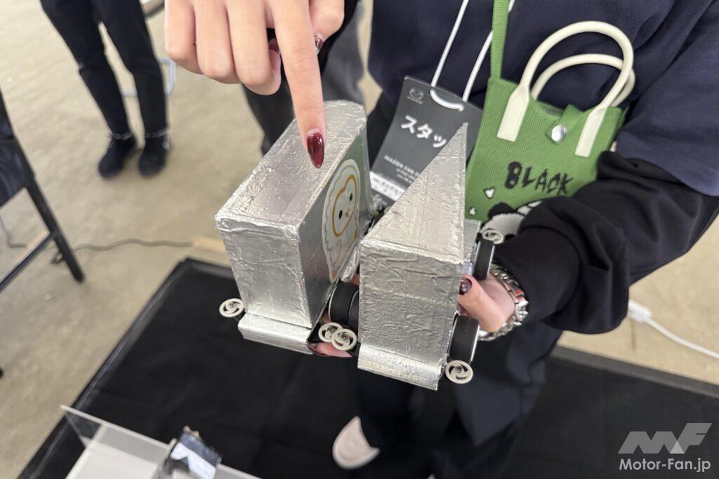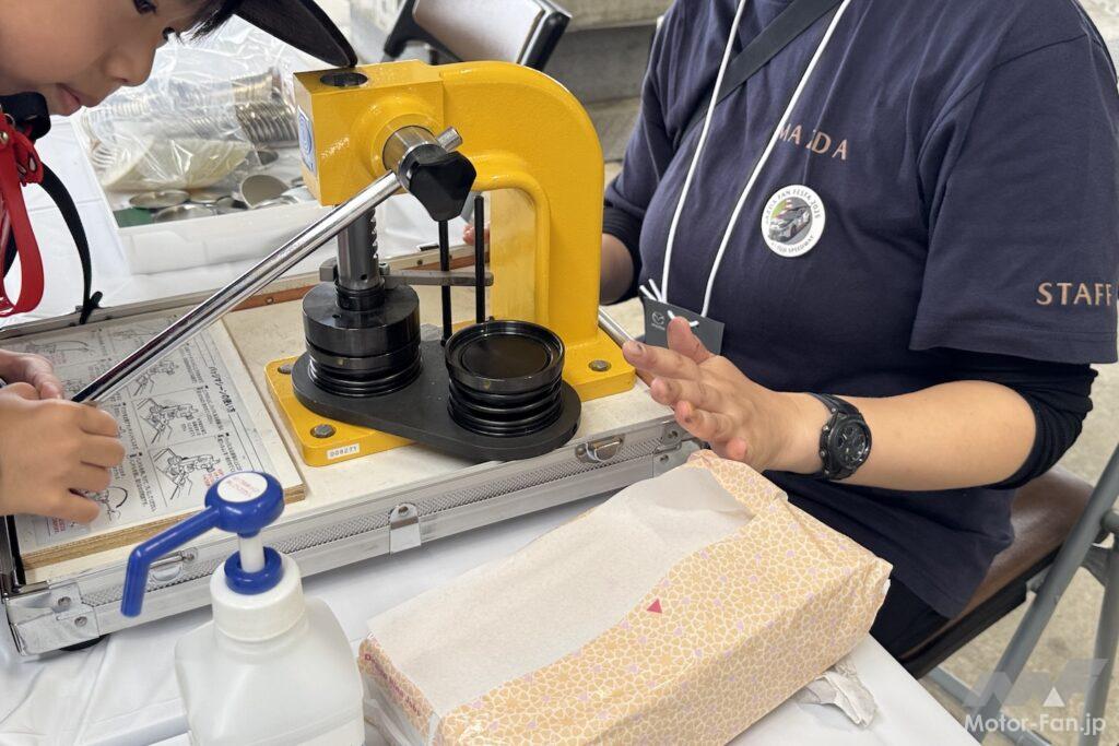 その一例として、「圧縮着火で火がつくエンジンの秘密」と題したブースをご紹介しよう。ここでは底に脱脂綿が入れられた細い筒が用意されており、その筒に棒を差し込んで勢いよく押し込むと、筒の中の温度が上がって脱脂綿に火が付く、というデモンストレーションを実演できる。ガソリンエンジンによる圧縮着火を世界で初めて実用化したマツダならでは、のコンテンツだ。