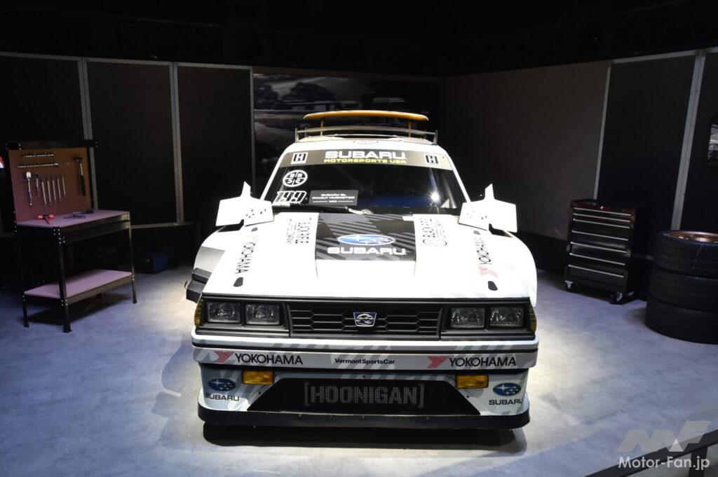 左右の「パフォーマンス」シーンと「アドベンチャー」シーンの間、中央のステージ奥に鎮座するのが「スバルGLファミリーハックスター」。スバルモータースポーツUSA/バーモントスポーツカー(VSC)が2代目レオーネツーリングワゴン(北米名:スバルGL)を大改造。トラビス・パストラーナ選手が数々のエクストリームドライブを披露したマシンだ。