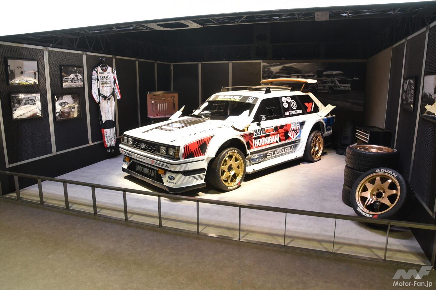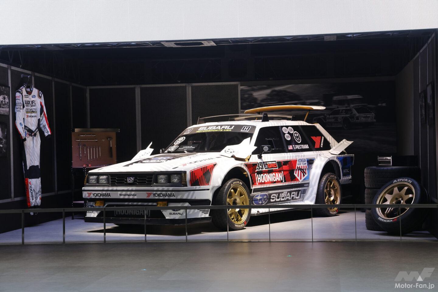 左右の「パフォーマンス」シーンと「アドベンチャー」シーンの間、中央のステージ奥に鎮座するのが「スバルGLファミリーハックスター」。スバルモータースポーツUSA/バーモントスポーツカー(VSC)が2代目レオーネツーリングワゴン(北米名:スバルGL)を大改造。トラビス・パストラーナ選手が数々のエクストリームドライブを披露したマシンだ。