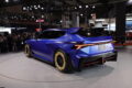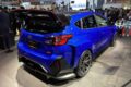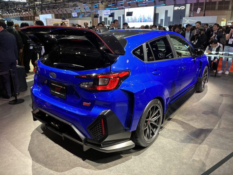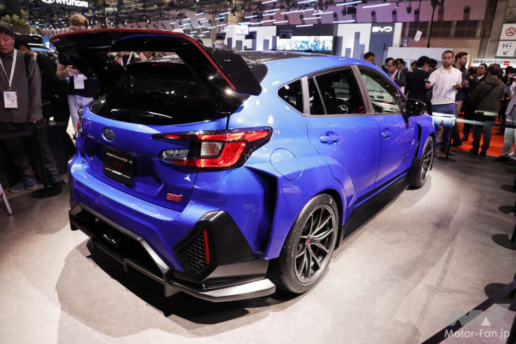 そしてもう1台アンベールされたエンジン車のコンセプトモデル「パフォーマンスB STIコンセプト」に会場はどよめいた。インプレッサ/クロストレックのハッチバックボディをド派手なオーバーフェンダーで大胆に拡幅。大柄なリヤスポイラーや攻撃的なフロントスポイラー、車幅いっぱいに広がるディフューザー形状のリヤスポイラーなどはスーパーGTマシンかWRCラリー1の如し。