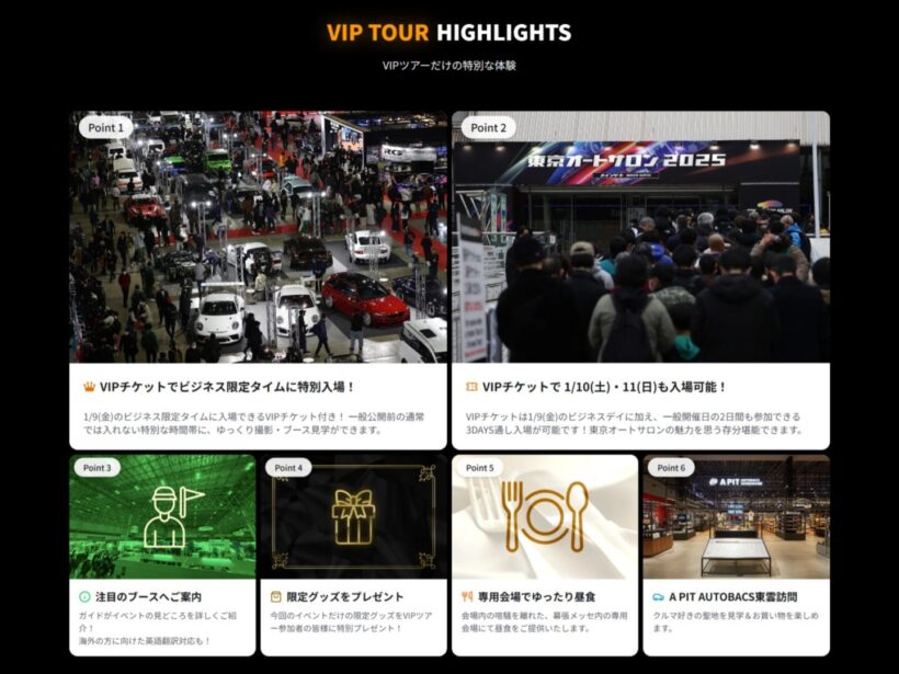 東京オートサロン 誰よりも早く撮影も可能! 特別な3日間を存分に体験できる東京オートサロン2026VIPツアー開催【写真・2枚目】 東京オートサロン2026 VIPチケット&3日通し券付きバスツアー 東京オートサロン2025 この画像の記事を読む