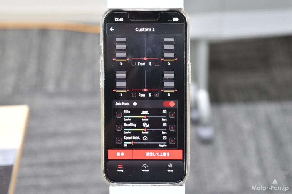 スマートフォンアプリはセッティング変更のほか、ショックアブソーバーの動作状況(減衰指令値)や車体の「G」をリアルタイムで表示する。