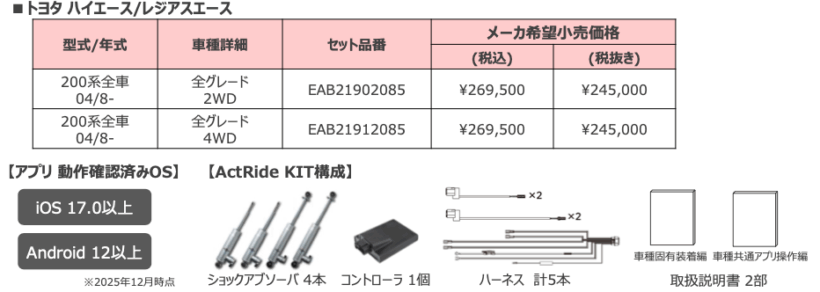 パーツ カヤバが電子制御サスペンションの新製品『ActRide』を発売!スマホで簡単セッティング!まずはハイエース用から【写真・7枚目】 カヤバ『ActRide』(ハイエース用)。 カヤバ『AcrRide』(ハイエース用) カヤバ『ActRide』(ハイエース用)の価格とセット内容。 カヤバのショックアブソーバーの構造変遷。 ステッピングモーター式とソレノイド式の違い。 ショックアブソーバーの頂部(車体側)に装着されるステッピングモーター。 トヨタ・ハイエースバン「スーパーGL」。ロングやワイドなど様々なモデルをラインナップするハイエースだが、『ActRide』は全モデルに対応可能。 ショックアブソーバーの下端横に突き出したソレノイド部。ソレノイド部から出ている黒い部分はハーネスを接続するソケット。 スマートフォンアプリの画面。 カヤバ『ActRide』のコントローラーはコンパクトにまとめられている。ハーネスも、電源と各ショックアブソーバーへの合計5本のみ。-40度〜60度までの耐温度性があり、寒暖差の激しい車内でも問題ない。 カヤバ『ActRide』(ハイエース用)のカットモデル。 カットモデルのソレノイド部。 カヤバ『ActRide』(ハイエース用)。 カットモデルのソレノイド部。 この画像の記事を読む