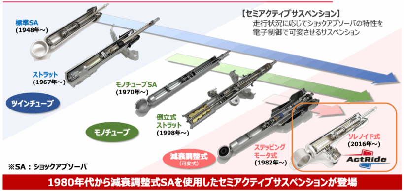 パーツ カヤバが電子制御サスペンションの新製品『ActRide』を発売!スマホで簡単セッティング!まずはハイエース用から【写真・11枚目】 カヤバ『ActRide』(ハイエース用)。 カヤバ『AcrRide』(ハイエース用) カヤバ『ActRide』(ハイエース用)の価格とセット内容。 カヤバのショックアブソーバーの構造変遷。 ステッピングモーター式とソレノイド式の違い。 ショックアブソーバーの頂部(車体側)に装着されるステッピングモーター。 トヨタ・ハイエースバン「スーパーGL」。ロングやワイドなど様々なモデルをラインナップするハイエースだが、『ActRide』は全モデルに対応可能。 ショックアブソーバーの下端横に突き出したソレノイド部。ソレノイド部から出ている黒い部分はハーネスを接続するソケット。 スマートフォンアプリの画面。 カヤバ『ActRide』のコントローラーはコンパクトにまとめられている。ハーネスも、電源と各ショックアブソーバーへの合計5本のみ。-40度〜60度までの耐温度性があり、寒暖差の激しい車内でも問題ない。 カヤバ『ActRide』(ハイエース用)のカットモデル。 カットモデルのソレノイド部。 カヤバ『ActRide』(ハイエース用)。 カットモデルのソレノイド部。 この画像の記事を読む