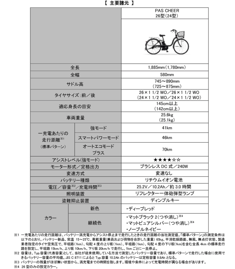 プレスリリース 充電回数を減らして、毎日をもっと快適に! ヤマハの電動アシスト自転車「PAS CHEER」2026年モデル登場【写真・2枚目】 電動アシスト自転車「PAS CHEER」の新色として「ディープレッド」に設定された。 PASシリーズ初採用となる10.2Ah新型バッテリーを搭載。 電動アシスト自転車「PAS CHEER」の新色として「ディープレッド」に設定された。 電動アシスト自転車「PAS CHEER」ノーブルネイビー 電動アシスト自転車「PAS CHEER」ノーブルネイビー 電動アシスト自転車「PAS CHEER」マットブラック2 電動アシスト自転車「PAS CHEER」マットブラック2 電動アシスト自転車「PAS CHEER」マットピュアシルバー 電動アシスト自転車「PAS CHEER」マットピュアシルバー この画像の記事を読む