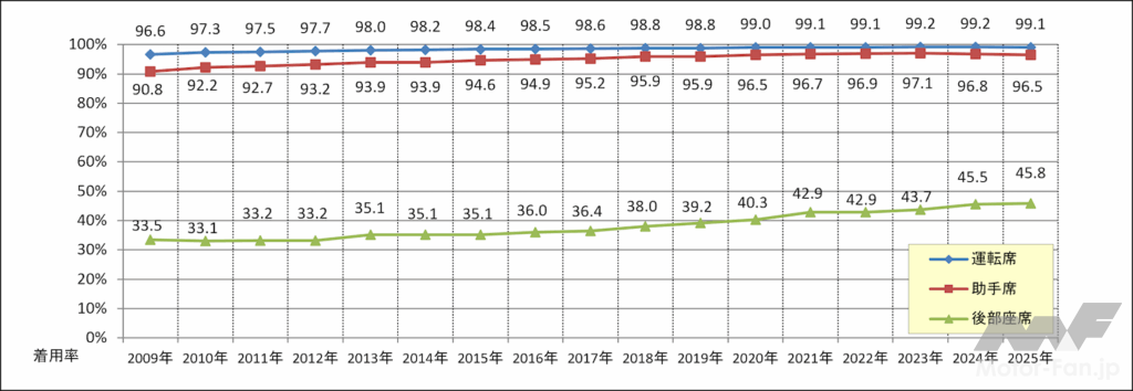 一方で、運転席の着用率は一般道路で99.1%、高速道路等で99.6%とほぼ完全着用。助手席も95%を超え、高い水準を維持している。
