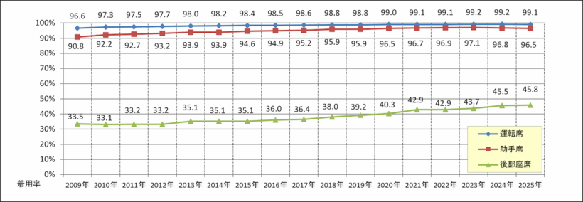 道路交通法 安全意識の浸透進まず! 一般道路の後席シートベルト着用率は45.8%【写真・4枚目】 日常的に一般道での鉱石シートベルト装着率の低さが際立つ。 一般道路における着用率の推移 一般道路の後席シートベルト着用率は45.8% 運転席のシートベルト着用率は一般道路で99.1%、高速道路等で99.6%とほぼ完全着用している。 この画像の記事を読む