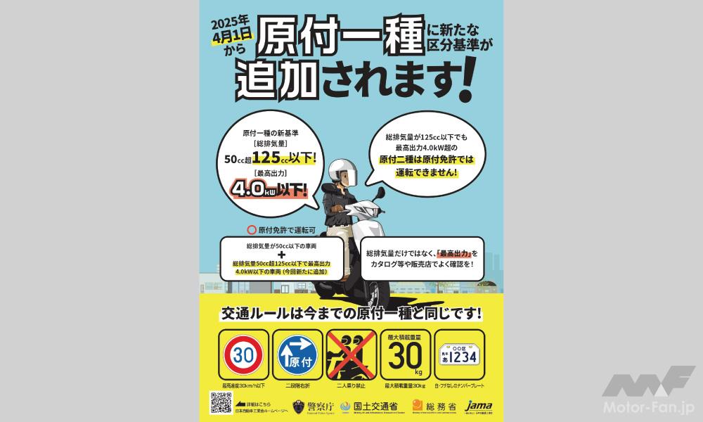 2025年4月1日より、原動機付自転車の車両区分が大幅に見直された。これにより、出力を制限した125cc以下の二輪車については、「新基準原付」として新たな区分に分類されるようになった。