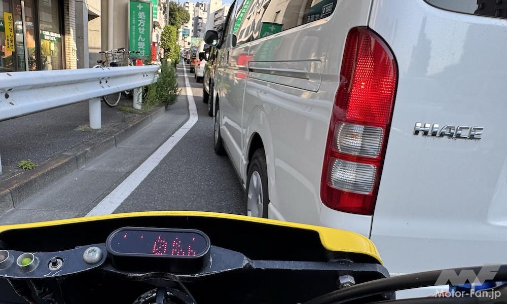 クルマとクルマの隙間を縫うように前方へ進むその走行スタイルは、バイク特有の機動性を象徴する動きともいえる。
