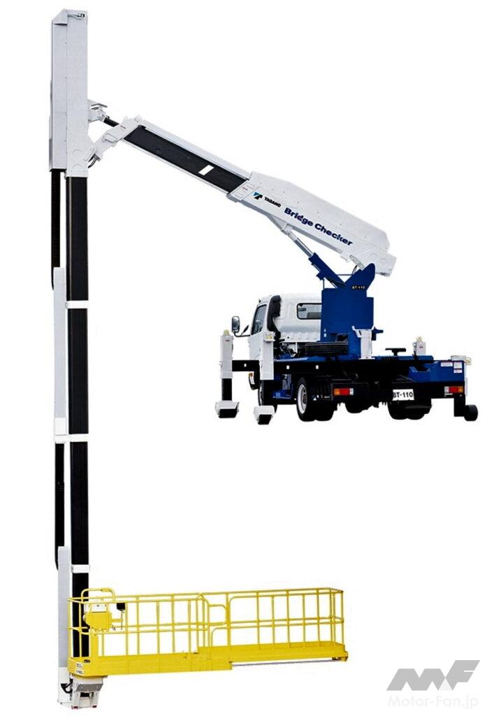 たとえば川にかけられた橋の下面に異常が無いかを検査する場合、川の中に入って高所作業クレーンを伸ばしたり、川の中に足場を組む必要があります。あるいは高い山あいにかけられた橋の下面を検査する場合、とても長い高所作業クレーンや高い足場が必要になることでしょう。そこで、橋の上から橋の下面側へと人を乗せたプラットフォーム(足場)やゴンドラを差し込み、橋梁の側面や下面のより効率的な検査や補修作業に用いられるのが橋梁点検車で、ブリッジチェッカーとも呼ばれます。
