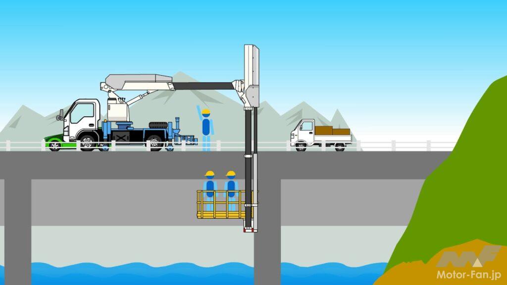橋梁点検車は図のように路上からブーム式昇降機によって作業員が乗ったゴンドラを下ろし、橋げたや橋の裏側などを点検するために使用されます。(PHOTO:いすゞ)