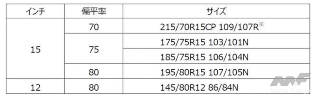 ヨコハマ「ブルーアース・キャンパー」サイズラインナップ
