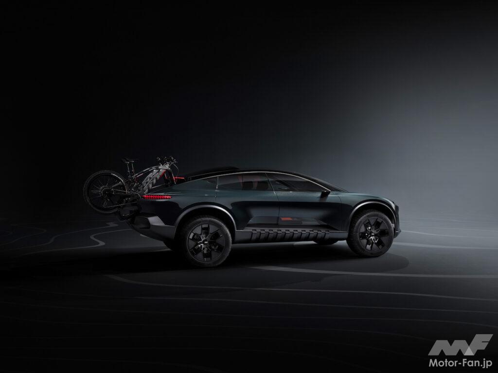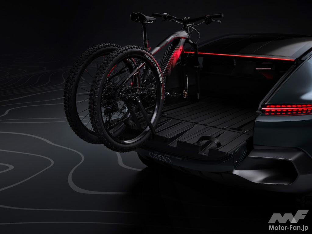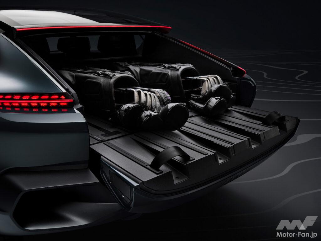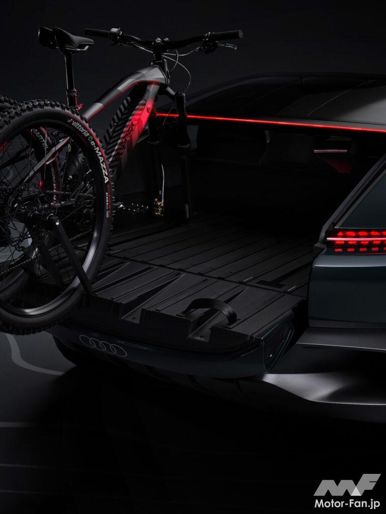 アクティブスフィア・コンセプトのリヤセクションは非常に特徴的だ。必要に応じて透明なリヤウィンドウスライドをルーフとほぼフラットな状態にできる。同時にリヤ下部の垂直部分が水平に折り畳まれる。これで電気自転車用のブラケットを備えたアクティブバックと呼ぶ荷台が出現する。