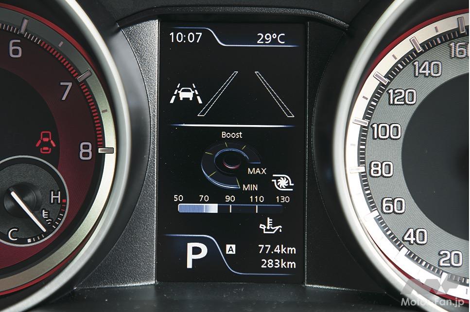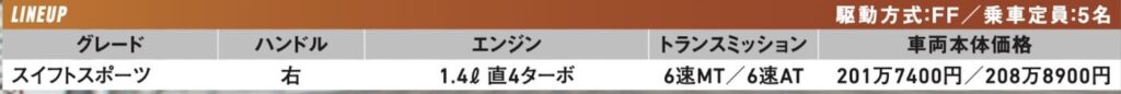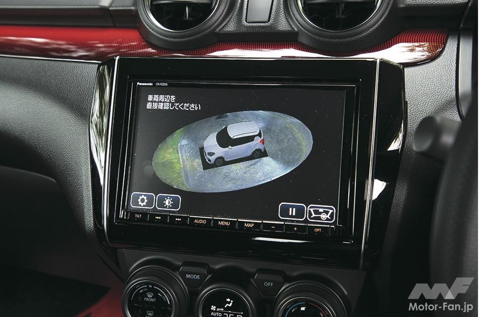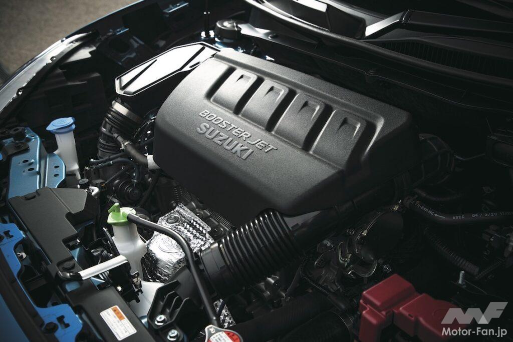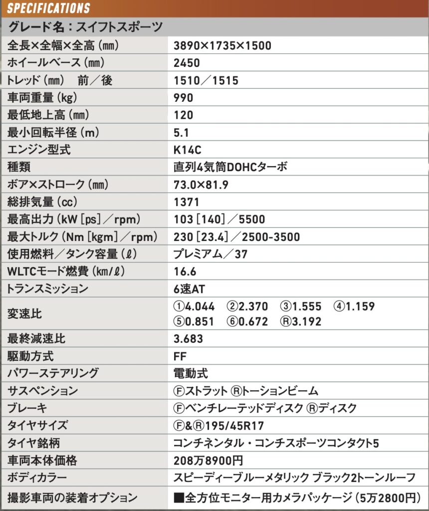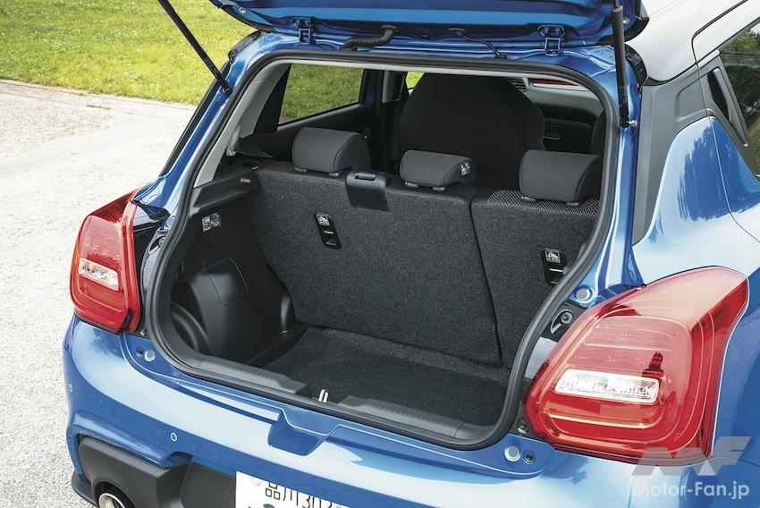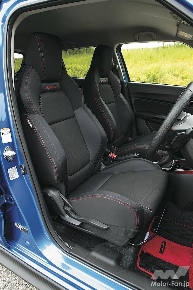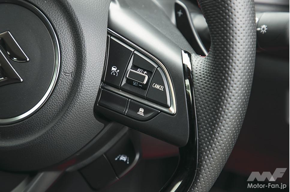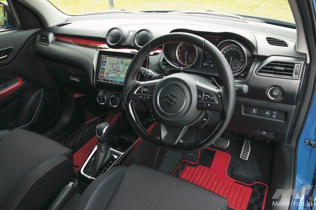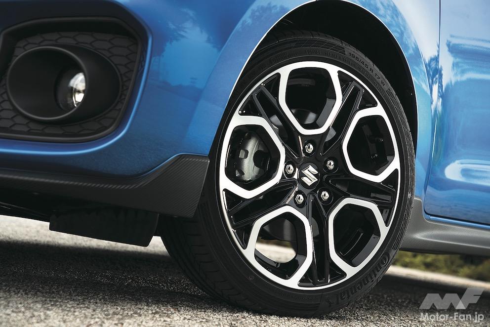 ボディパネルはフェンダー、ドアパネル、そしてリヤクォーターパネルに至るまでベースモデルから変更することで、安定感のあるスタイルを手にしたのが見どころ。全幅は1735mmにもなる。スイフトとは思えないサイズ感だ。ただし、超高張力鋼板を従来の3倍も使うことでウエイトダウンにつなげている。また、スポット打点をベースモデルに対して12点追加。さらにアンダーカバーをボディ下部に備えるなど、高速走行時の安定性や燃費に対する考え方も改まった。