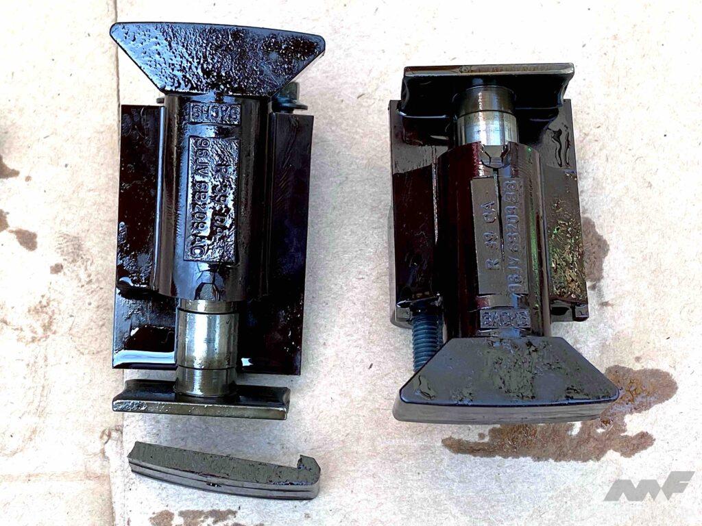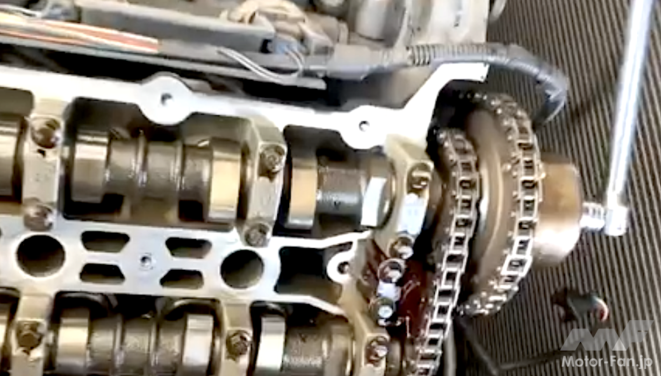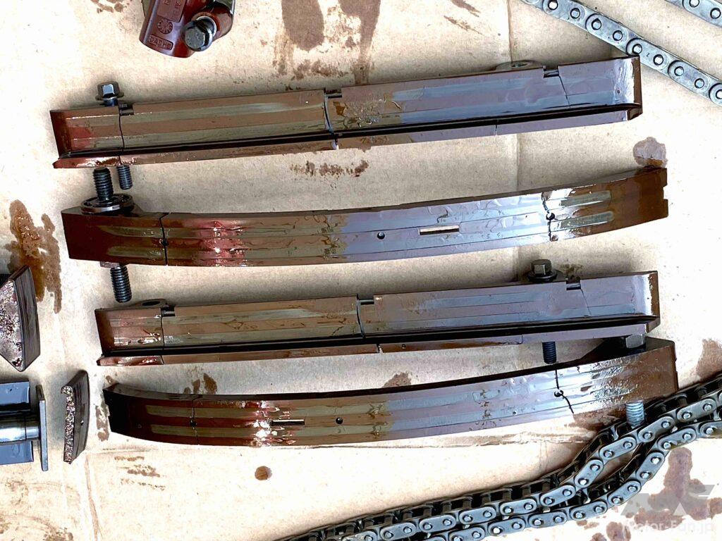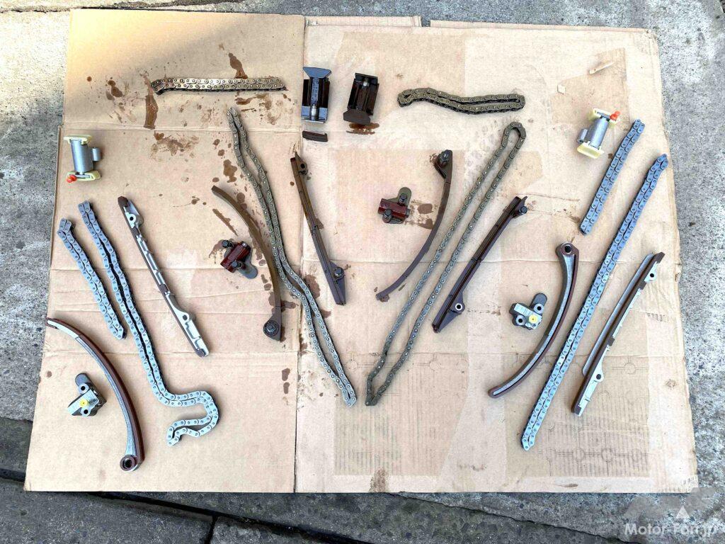 タイミングチェーン周りの部品を改めて見ると、いやはや酷いことになっていた。チェーンの弛みを調整するテンショナーは樹脂製で、ここが割れて粉砕するとチェーンの張りを維持できずコマ飛びを起こす。バルブ開閉のタイミングがズレてしまうため、最悪ヘッドのオーバーホールが必要になる。