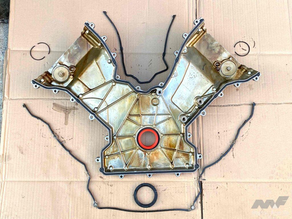 続いてヘッドカバーを外してからフロントカバーを外したのが上の写真。すでにタイミングチェーン周りの部品を外した状態で、こうして見ると整備性は悪くないように思える。
