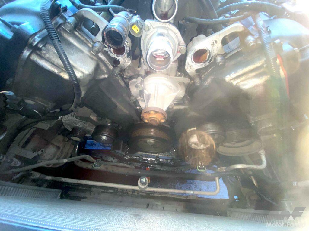 エンジンのフロントカバーからのオイル漏れを直すには、ヘッドカバーとフロントカバーを外してパッキンやガスケットを交換すれば良い。だが長澤さんの経験によると、このV8エンジンはタイミングチェーンに使われているテンショナーやダイドに問題が多々あるとのこと。そこでタイミングチェーンやテンショナーなど一式を交換することになった。まずフロントカバーを開けるためラジエターの強制ファンなどを外す。さらにドライブベルトを外したのが上の写真だ。