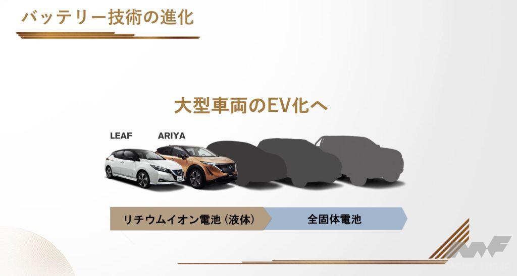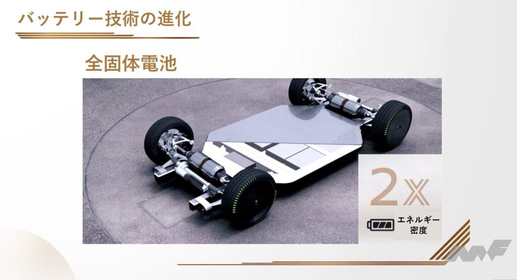 平井氏:ふたつあります。容量50kWhは全固体電池でも50kWhです。しかし、エネルギー密度が上がればコンパクトにはできます。コンパクトにできることで構造体のコスト低減は間違いなくあります。もうひとつは、使っている材料そのものに、ニッケル、マンガン、コバルトといった高価な材料を使わない。材料改革が全固体電池の一番のポイントですので、それが達成されることによって材料単価を下げてコスト削減を図るということで、コストを半分にしようと考えています。