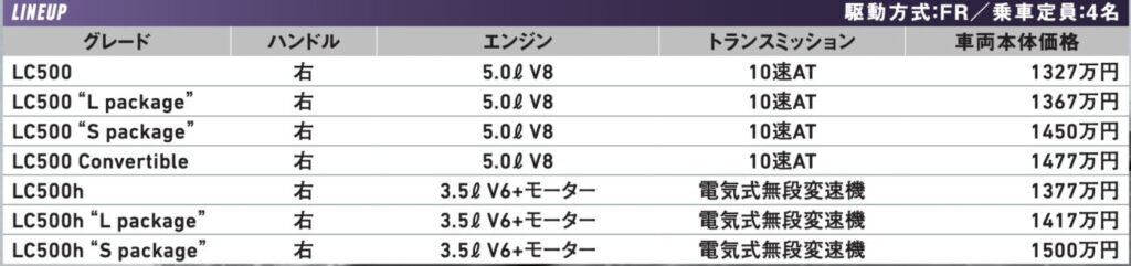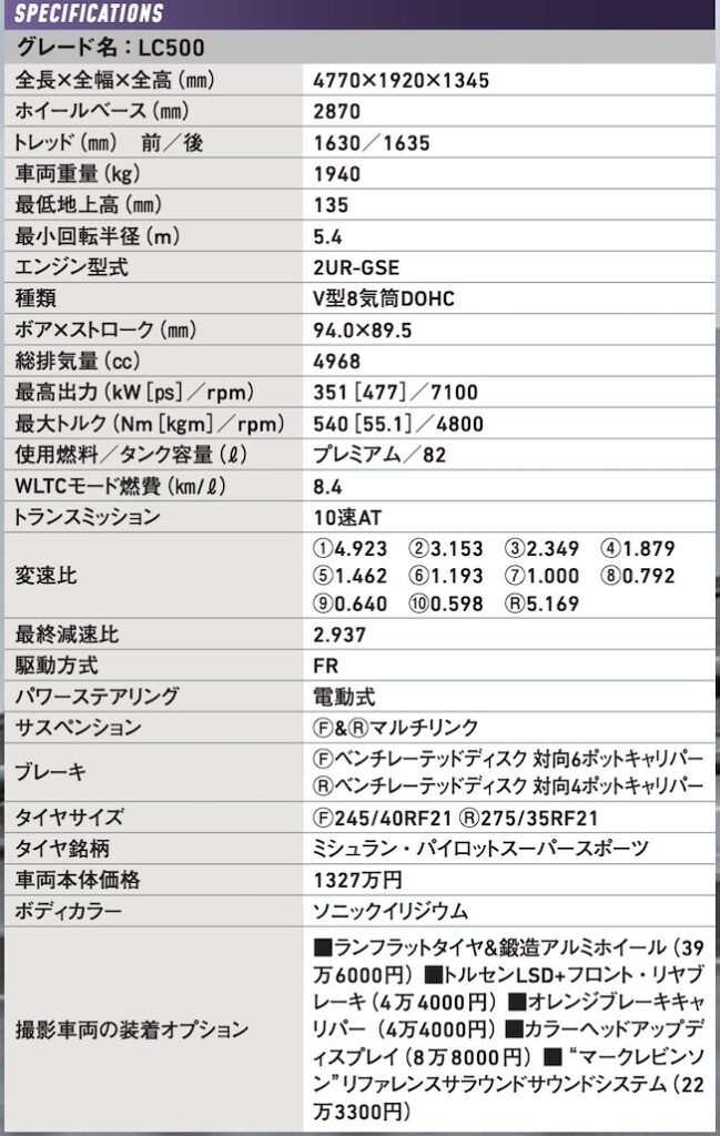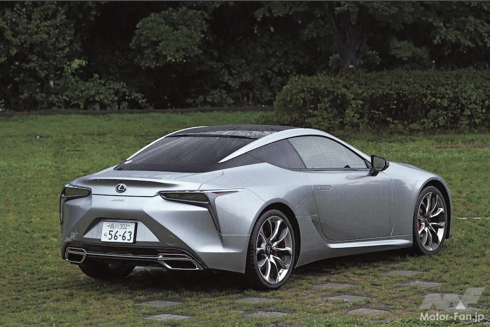 LC最大の売りは、そのデザインや室内調度、乗り心地などから醸し出される質感、贅沢感、肌ざわり、高級感……である。歴史的に機能性やコスパで勝負してきた日本車としては、ある意味で最も苦手とするジャンルであり、純粋な高性能スポーツカーよりも挑戦的ともいえる。とはいえ、5.0ℓ V8もしくは3.5ℓ V6ハイブリッドを搭載するLCは、レクサス=トヨタでも最も速い部類に入る。基本骨格はLCで初登場したトヨタ自慢の縦置きレイアウトで、その後にLCやクラウンにも採用されたGA-Lプラットフォームだ。GT-RやNSXのような4WDは用意されず、全車が後輪駆動のFRとなる。