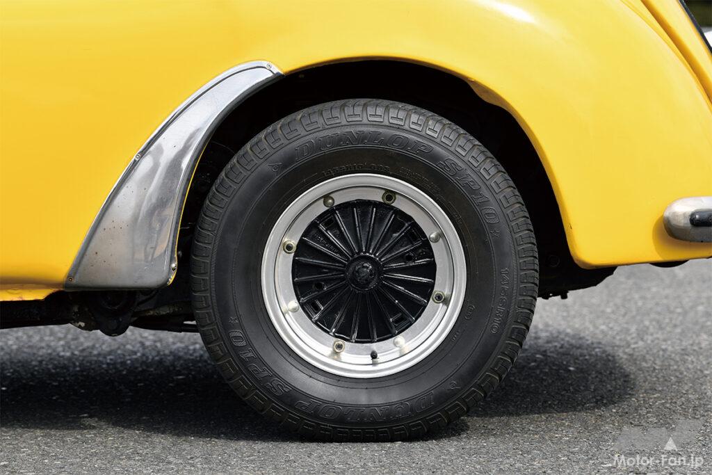 足元はモンキーなどのミニバイク用として売られているアルミホイール。合わせホイールのため、2個だけ買って裏側は純正を使えば4本できあがるため経済的。145タイヤがピッタリになる。