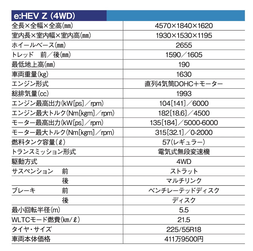 パワーユニットはシビックと同じで、1.5ℓターボと2.0ℓハイブリッドの〝e:HEV〞を揃える。前者はハイオク仕様のシビックとは異なり、レギュラーガソリンに対応している。ターボエンジンは低速から力強く、加速時もエンジン回転を上げるより過給圧の上昇を使ってトルクで押し出してくるチューニングなので、大排気量エンジンのような力感がある。e:HEVもエンジンが直噴化され、低回転高負荷域での効率が高まったため、エンジン回転を先走らせることがなく、全開加速時にはステップ変速的にエンジン回転を変化させるなどの演出も行なわれる。