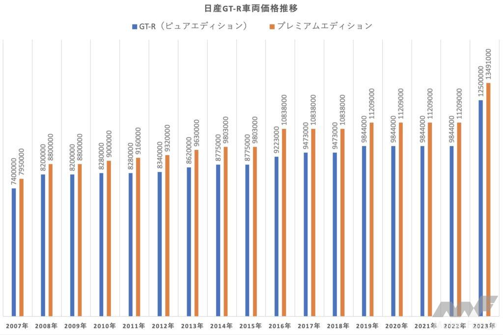 エントリーグレードの価格は2007年の740万円から2023年の1250万円まで上昇している。価格は168.9%、つまり2007年から価格が1.7倍になったということだ。同じくプレミアムエディションも169.7%、1.7倍だ。