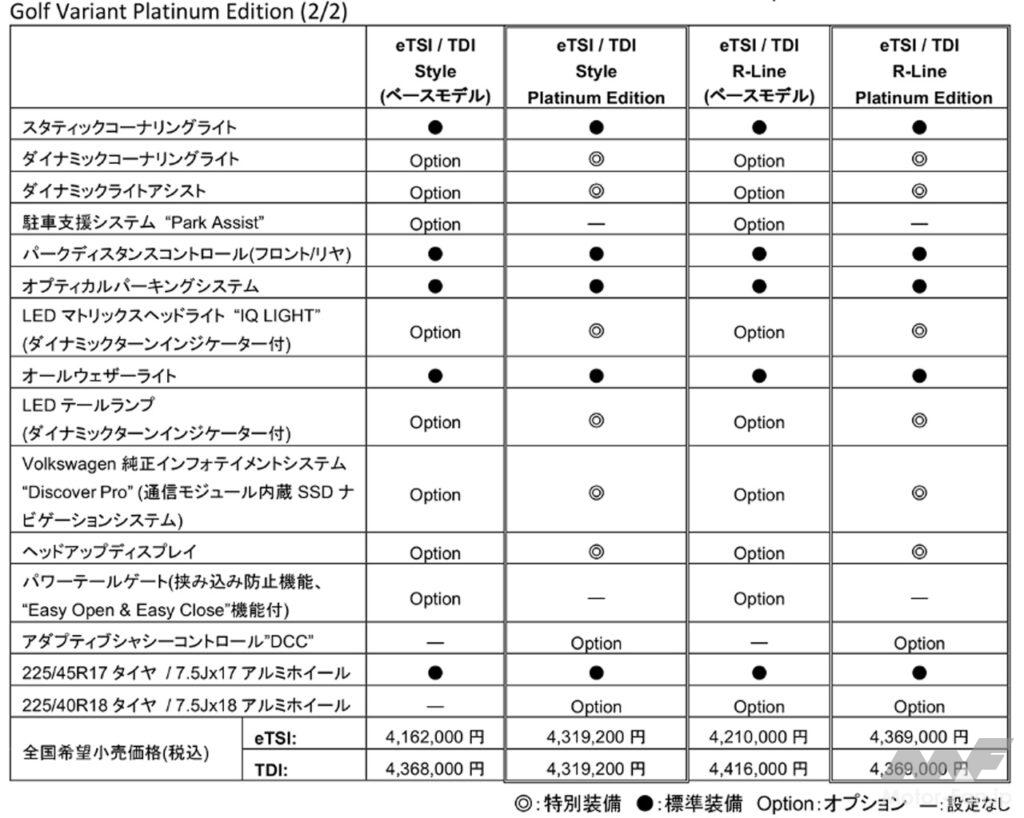 日本におけるフォルクスワーゲン70周年を記念し、「Platinum Jubilee(70周年記念)」にちなんで名づけられた「Golf Platinum Edition」「Golf Variant Platinum Edition」は、これまでの日本のお客様からのご愛顧に同社が感謝の気持ちを込め、通常オプションとして人気の高い装備を標準としながら、大幅に価格をおさえた買い得感の高い仕様としたほか、これまでスポーツグレードであるGTI、Rにのみオプション設定となっていたアダプティブシャシーコントロール“DCC”を18インチアルミホイールとのパッケージオプション(税込22万円)として選択可能とした(eTSIアクティブを除く)。そのほか、プラチナムエディションの特別装備アイテムは下表のとおり。
