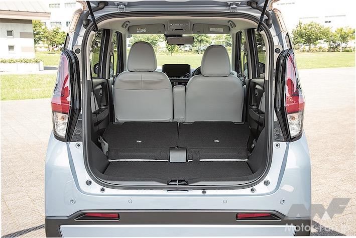 だからもちろん、EVになったからといって、室内の広さや使い勝手はまったく犠牲になっていない。総電力量20kWhのリチウムイオン電池は薄く床下に敷き詰められ、室内長2065㎜、室内幅1340㎜、室内高1270㎜というガソリンモデルと同じ寸法を実現。後席は前後スライド&5対5分割での前倒しが可能。荷室容量も、ガソリンモデルの4WDとほぼ同等となる118ℓ(床下収納9ℓを含む)を確保。床上空間の容量は2WDモデルと同等なので、日常の使い勝手は良好だ。