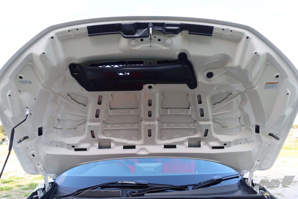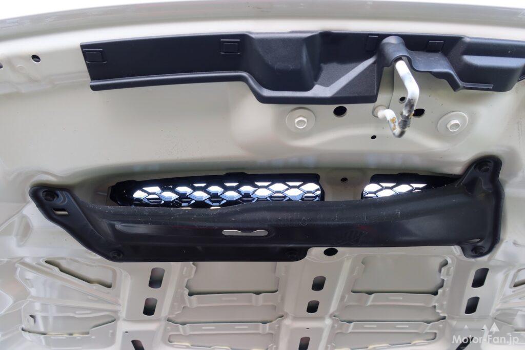 ボンネットフードを開けて裏を覗くと、空気をすくうように受けるためのガイドが付いている。ラジエーター冷却風をエンジンルームに入れず、フロントグリルから入れてボンネットで抜くのは、量産車ベースのレーシングカーでは設計のセオリー。タイプRの場合は完全に独立したダクトが形成されているわけではないが、多分にレーシングカー的な設計になっている。