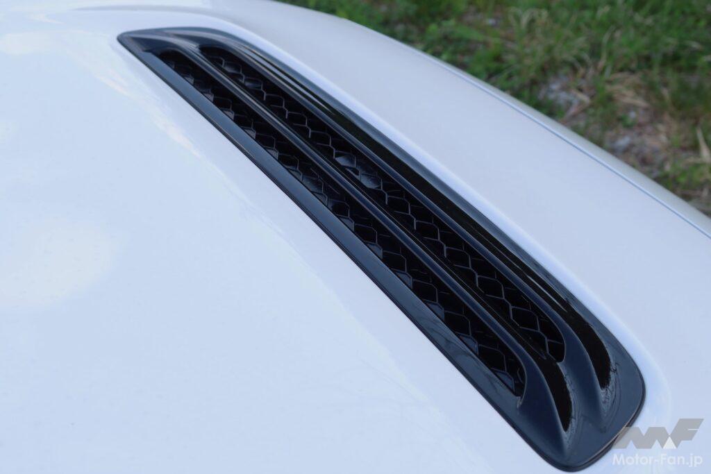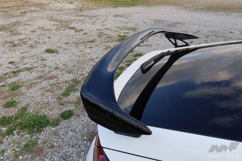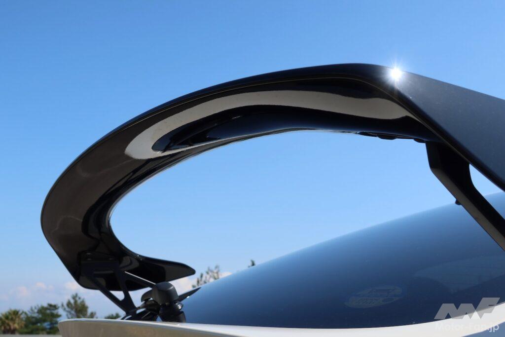 「これで効果ある?」と疑問に思うかもしれないが、空気はリヤウインドウに沿って降りてくる。そう考えると、充分に迎え角は付いており、相応のダウンフォースを発生しそうなことがわかる。広報資料には、200km/h時に580Nのダウンフォースを発生するとの記述がある。空気が横から回り込んでくる両端部はきちんと角度が付いており、よく練られた形状だ。