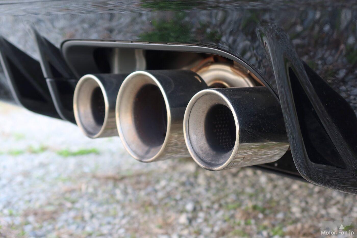 後ろにまわってリヤウイングを見ると、やはり「よくできていますね」とコメント。「CFD(コンピューターを用いたシミュレーション)や風洞でさんざん試したのでしょう」と永嶋氏は目を光らせる。リヤウイング中央部の角度はほぼ水平で、