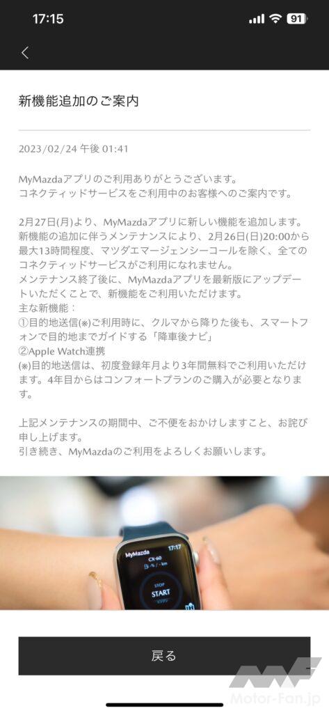 2月24日、スマートフォンのMyMazdaアプリに「新機能追加」のお知らせが届いた。「目的地送信」利用時に、クルマから降りた後もスマホで目的地までガイドする「降車後ナビ」が追加されたとの内容だ。MyMazdaとApple Watchが連携し、一部機能がApple Watchで利用できるようになる旨も記されていた。アプリを最新版にアップデートすることで使えるようになる。