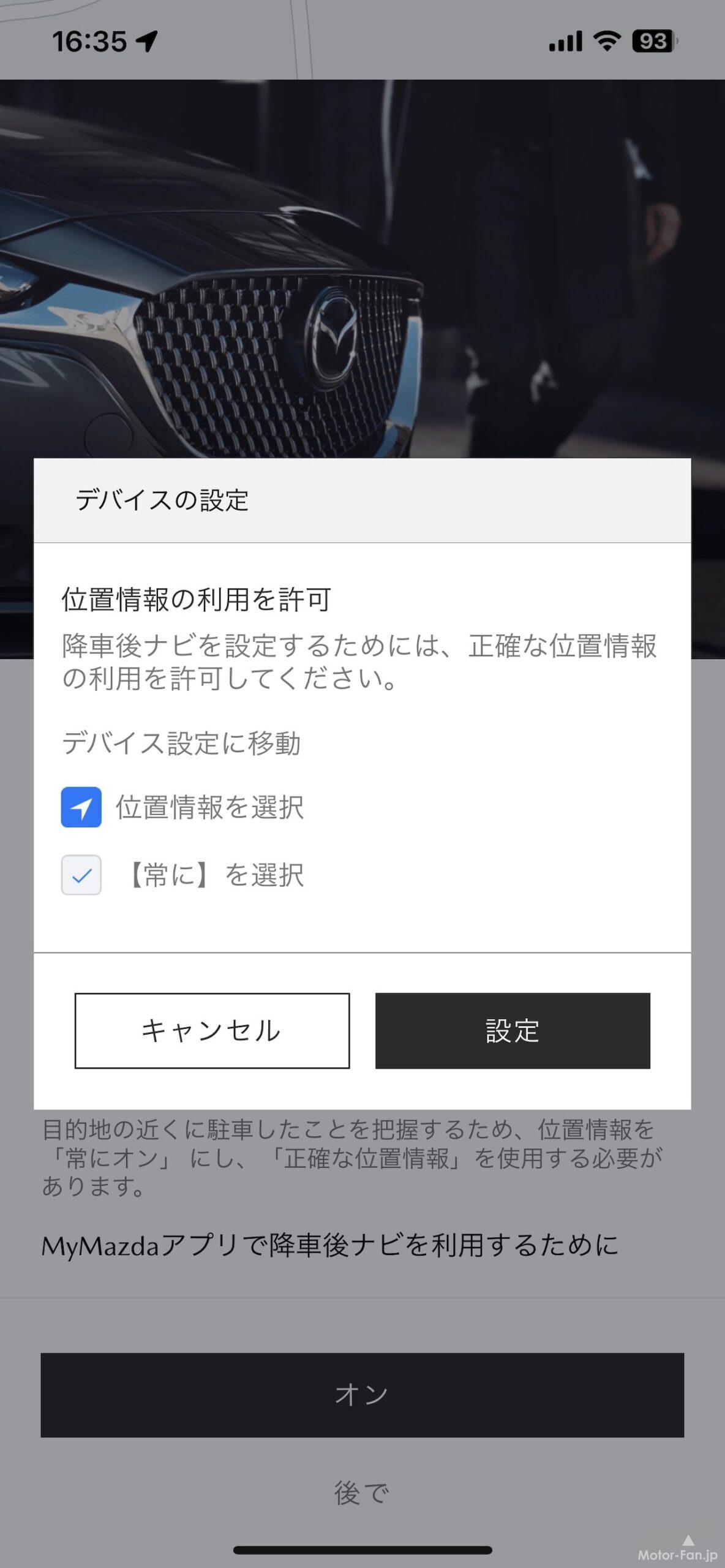 MyMazdaアプリで降車後ナビを有効にするためには、スマホで位置情報の利用を許可する必要がある。設定確認後、いつものように目的地を車両側に送信すると、「降車後ナビは有効です」のメッセージが確認画面に表示されるようになった。目的地まで約500m以内になると、「目的地までの案内を開始しますか?」のプッシュ通知がスマホに届く。