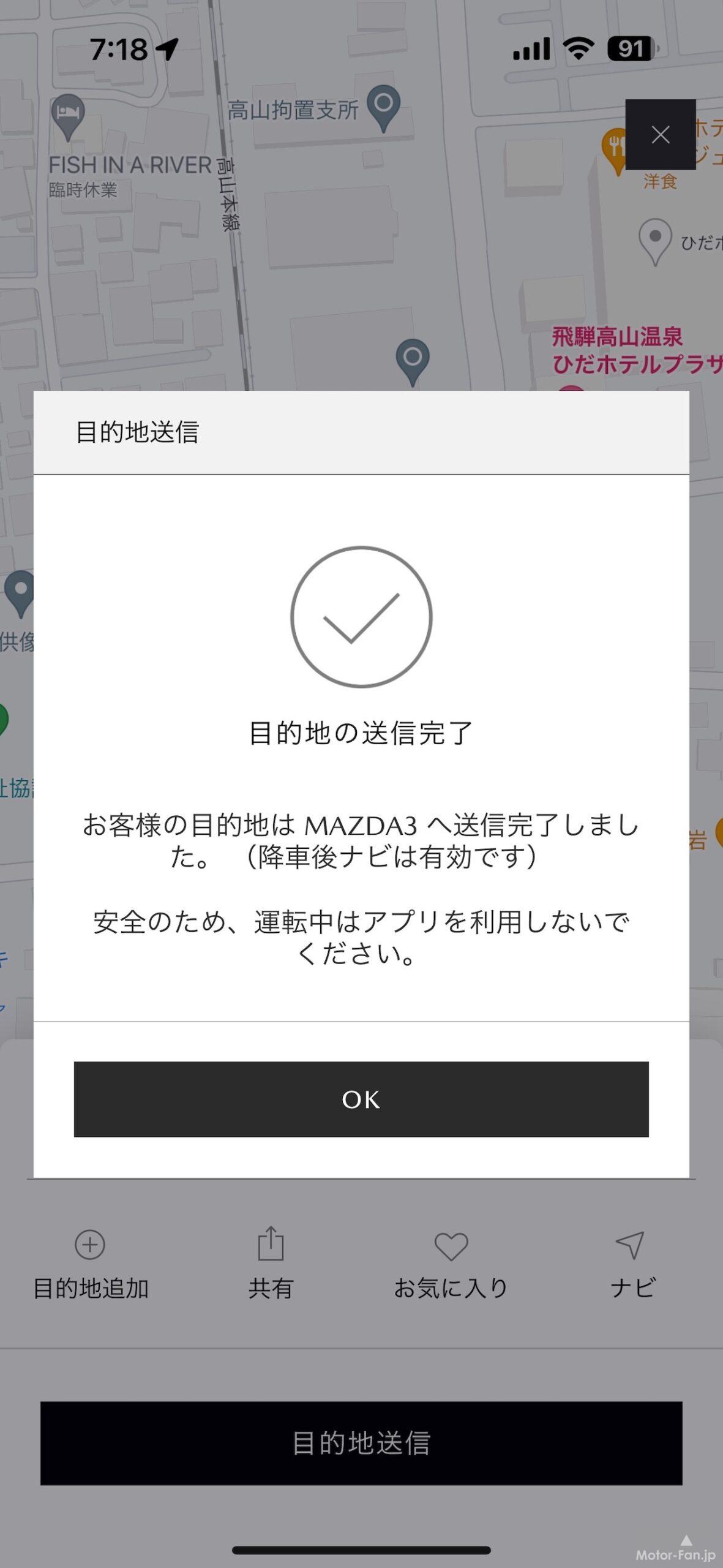 「目的地送信」はMyMazdaアプリ内で検索した目的地情報を車両のナビゲーションシステムに送信できる機能だ。出かける前に設定しておけば、出発の際に手間いらずで便利だし、クルマに乗り込んでからの目的地設定もコマンダーを操作するよりはるかに簡単で重宝している。