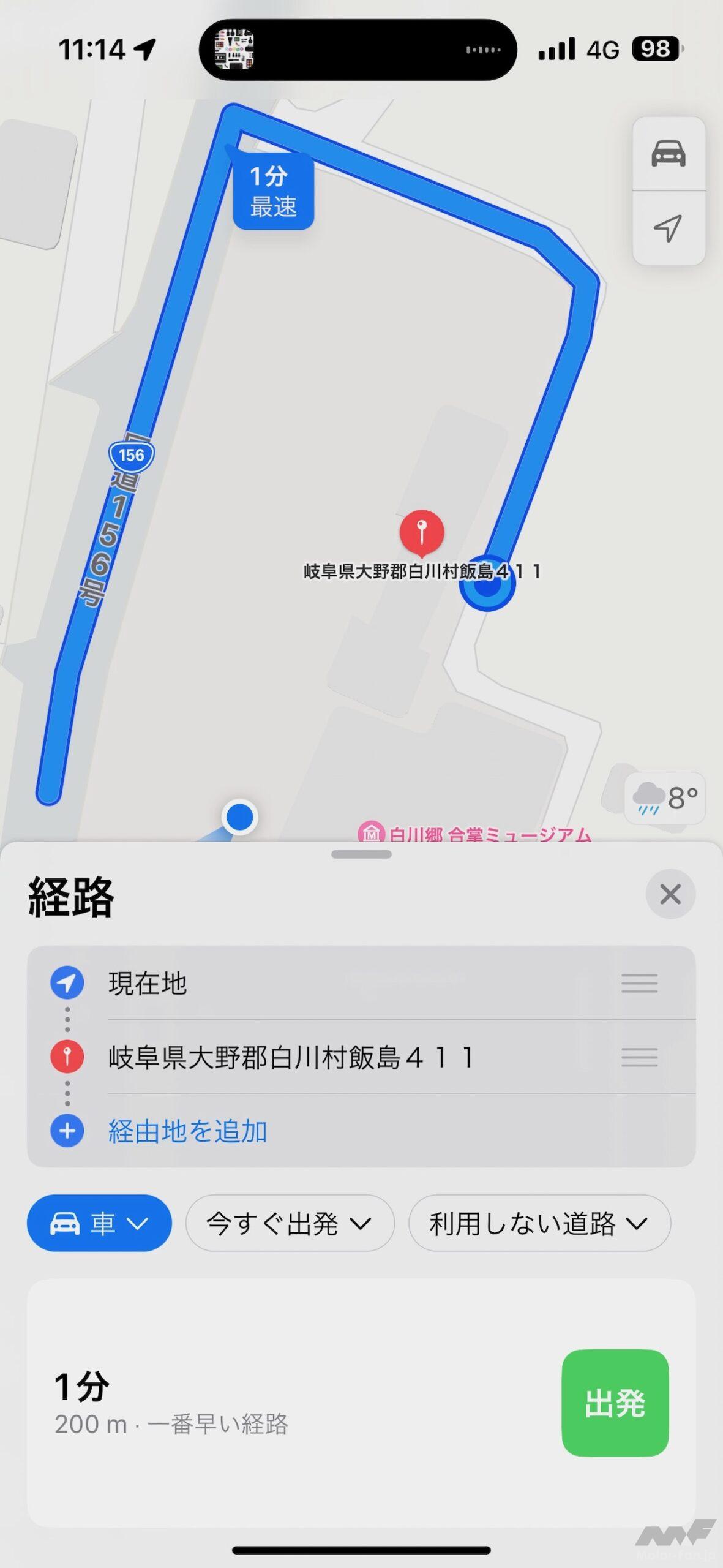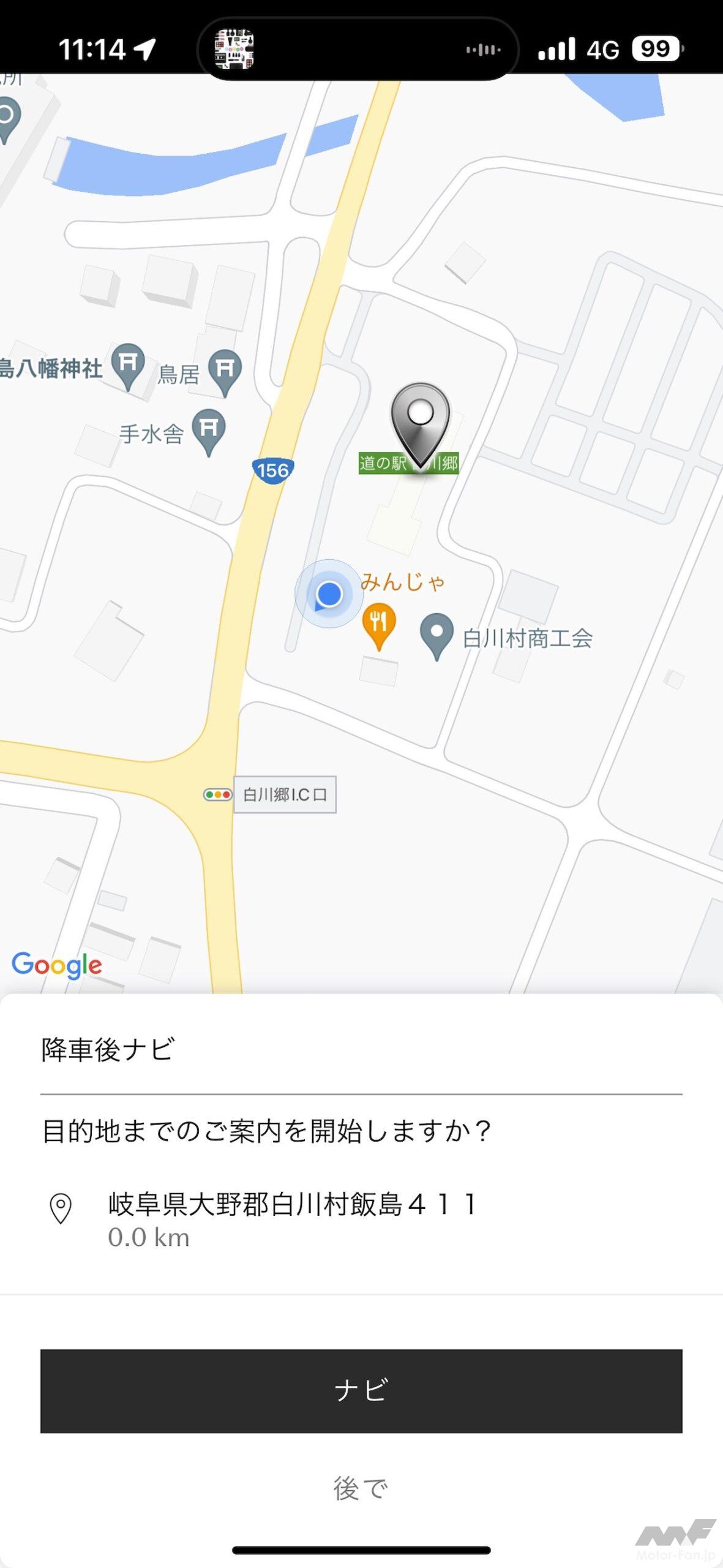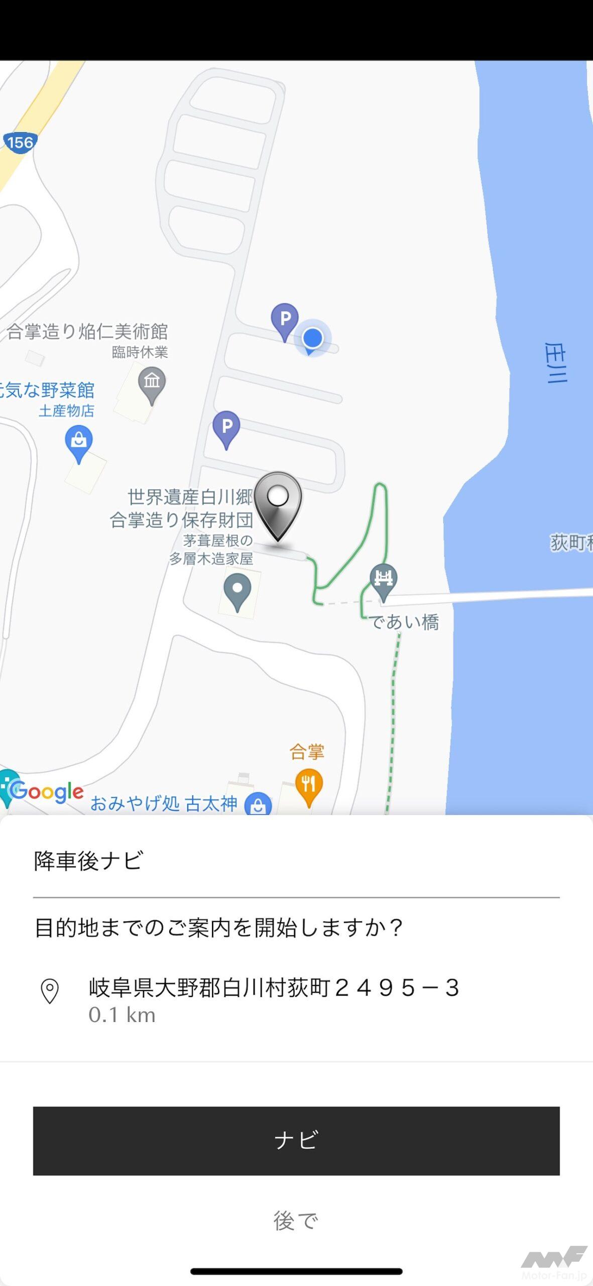 目的地付近に到着後、MyMazdaアプリを開いて「ナビ」をタップすると、地図アプリが開いて降車後ナビがスタートする。目的地から離れたところにクルマを止めざるをえず、そこから相応の距離を徒歩で移動するようなシーンで役立ちそうだ(これまでのところ、目的地至近にクルマを止められることが多く、便利さを実感できていない)。