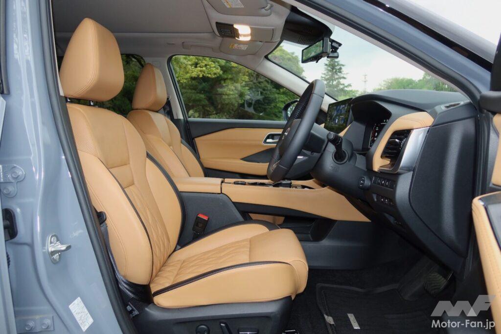新型エクストレイルの開発にあたっては、上質感を求める声に応えようと意識したという。試乗車はオプションのナッパレザーシート(88000円)装着車だった。色合いもいいし、シートやダッシュパネル、スイッチや加飾パネルの質感は高く、それらを含めた室内全体の雰囲気は上質に感じた。エクステリアはオフローダーらしいタフさを残しながら、品の良さを感じさせるスタイルでまとまっている。