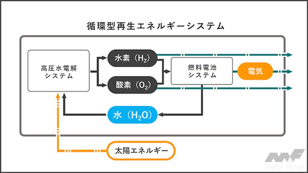ホンダが持つ燃料電池技術と高圧水電解技術を組み合わせ、再生可能エネルギー由来の電力を使い、水を電気分解して水素・酸素として貯蔵し、その水素と酸素から燃料電池技術を用いて発電し、電力の供給が可能となる。また、酸素は月面に滞在する人の居住用としても、水素はロケットの燃料としても、それぞれ活用可能であるなど、ホンダは循環型再生エネルギーシステムの構築により、さまざまな有人活動への貢献を目指している。