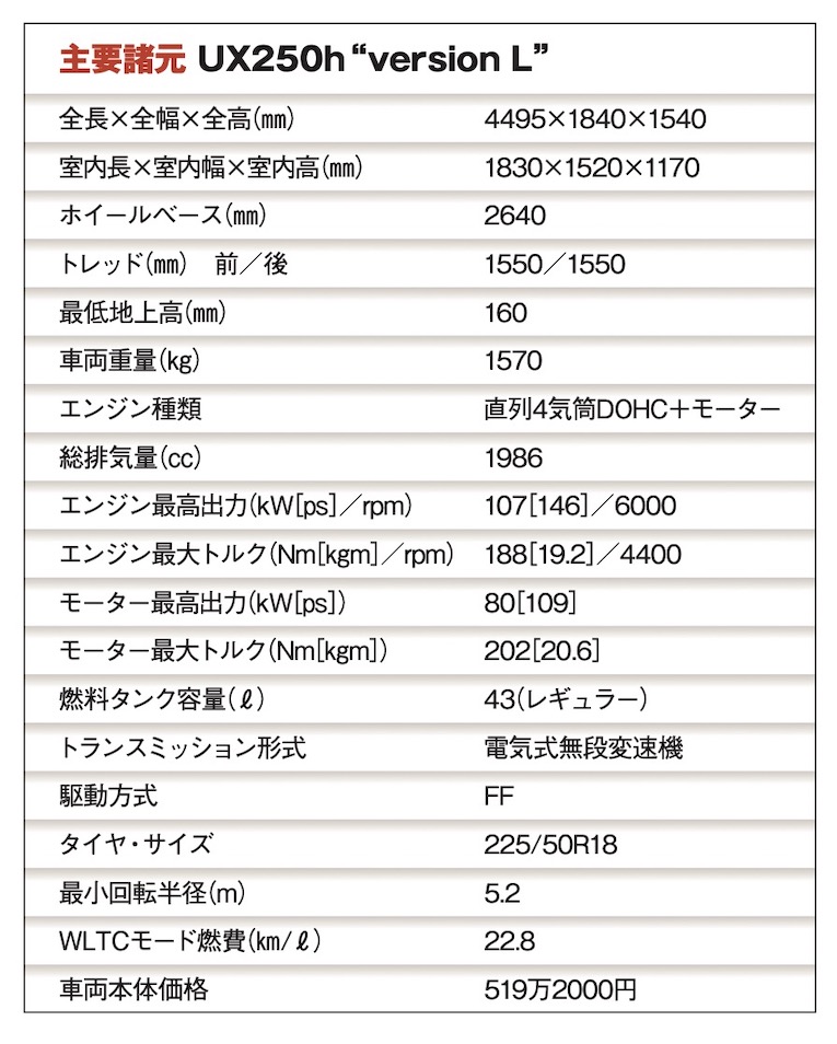 リヤゲートを寝かせたから、背の高い角張った荷物は積みにくいが、リヤゲートのヒンジが前寄りに装着されるため、開閉時に後方への張り出しが少ない。従って縦列駐車をしているときなど、ボディ後方の空間が狭い場所でも荷物を出し入れできる。このようにUXは、コンパクトなボディを含めて日常的な使い勝手が優れている。毎日の移動の中で、上質な運転の楽しさを満喫できる。