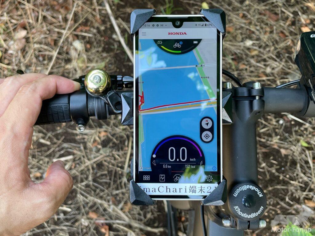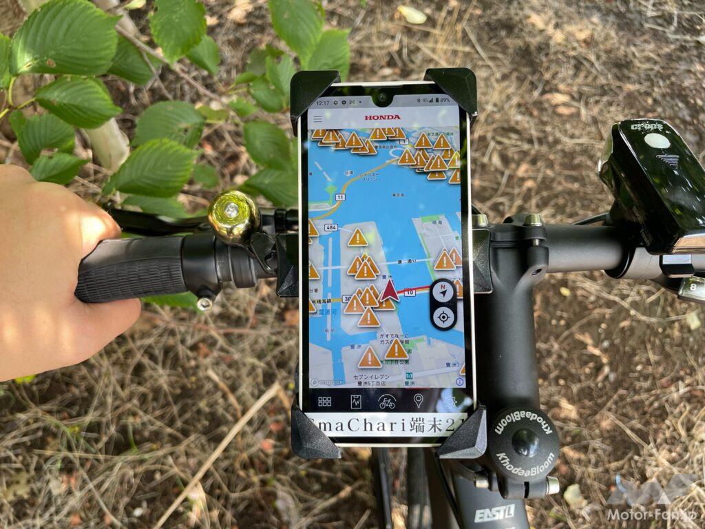「スマチャリ」はアプリ上で、速度や走行距離、消費カロリーといった走行データを表示・記録することに加え、ホンダのカーナビなどから収集されたデータをもとに、自動車の急ブレーキが多い場所を表示する。要注意スポットに近づくとスマートフォンからアラート音が鳴る仕組みも搭載されている。