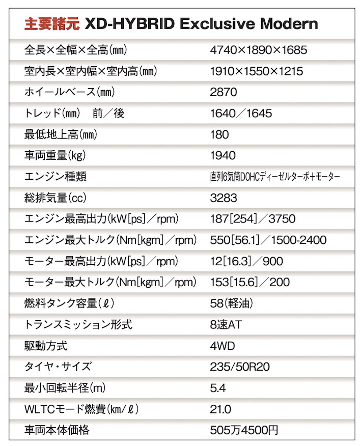 月間販売台数 2104台(22年9月〜23年2月平均値) 現行型発表 22年4月 WLTCモード燃費 21.1km/l ※「XD-HYBRID Exclusive」系