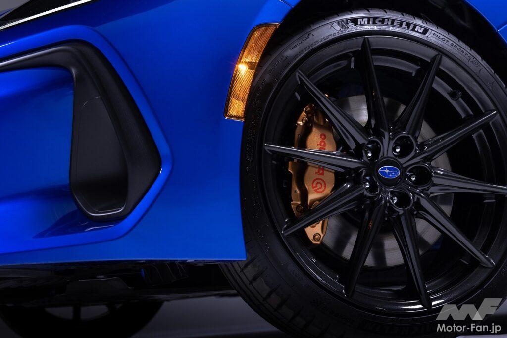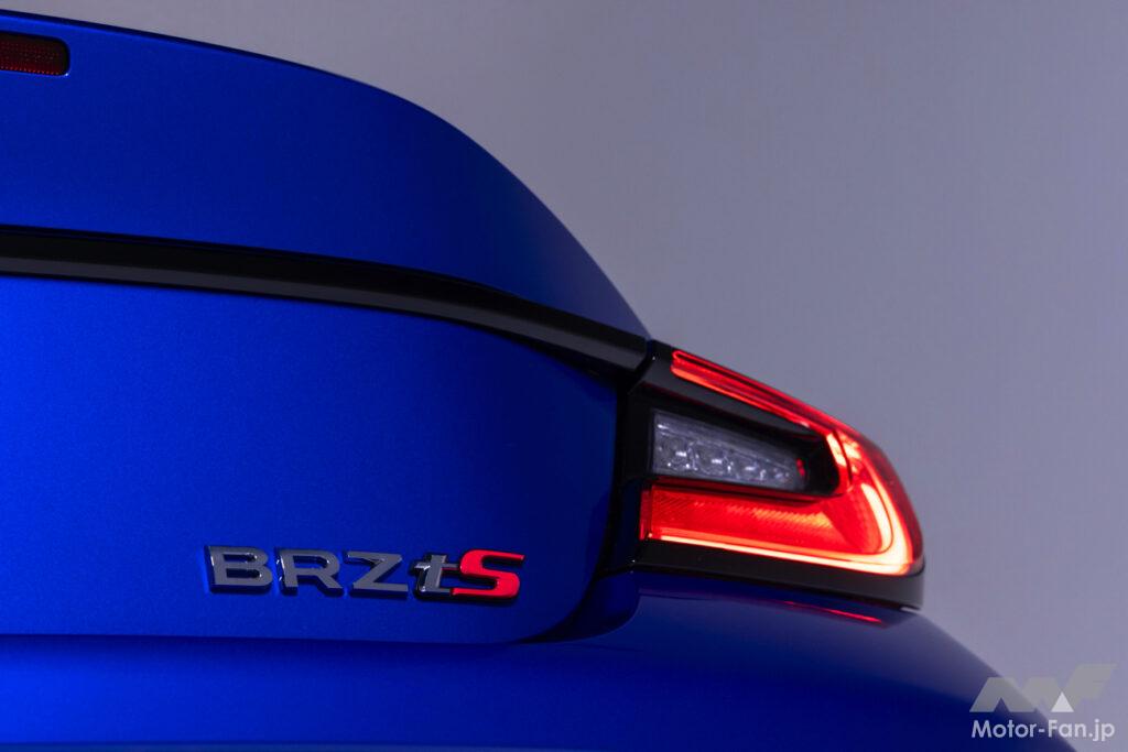BRZ tSにはフロントグリルとリアトランクリッドに「tS」のバッジが装着されるほか、可倒式ミラーとルーフのシャークフィンアンテナはクリスタルブラックシリカ仕上げで、ボディ全体のイメージを引き締めている。カラーはBRZの2024年モデルの全色が選択でき、18インチアルミホイールはダークグレー仕上げとなっている。