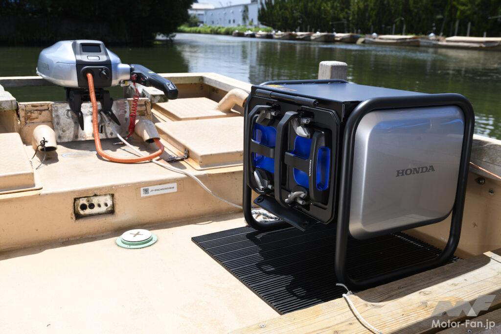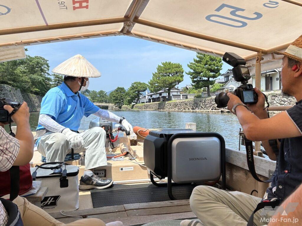 この分野も電動化は喫緊の課題だ。ホンダは2021年11月に電動推進機のプロトタイプを公開している。今回、「カーボンニュートラル観光」を掲げる島根県松江市の松江城周辺を周遊する「堀川遊覧船」で実際に4kW電動推進機プロトタイプを使った実証実験を開始した。