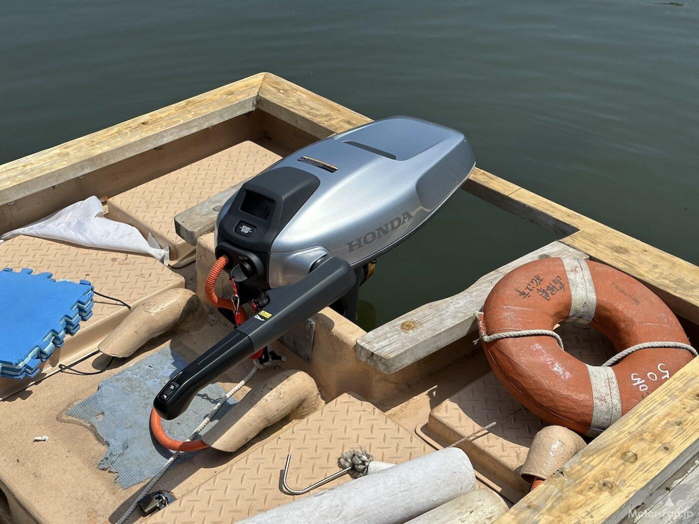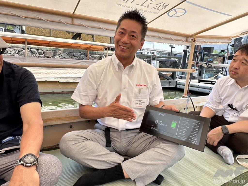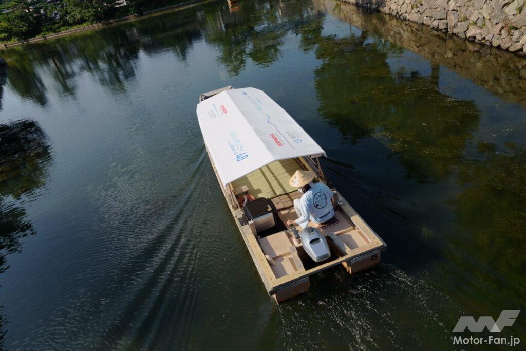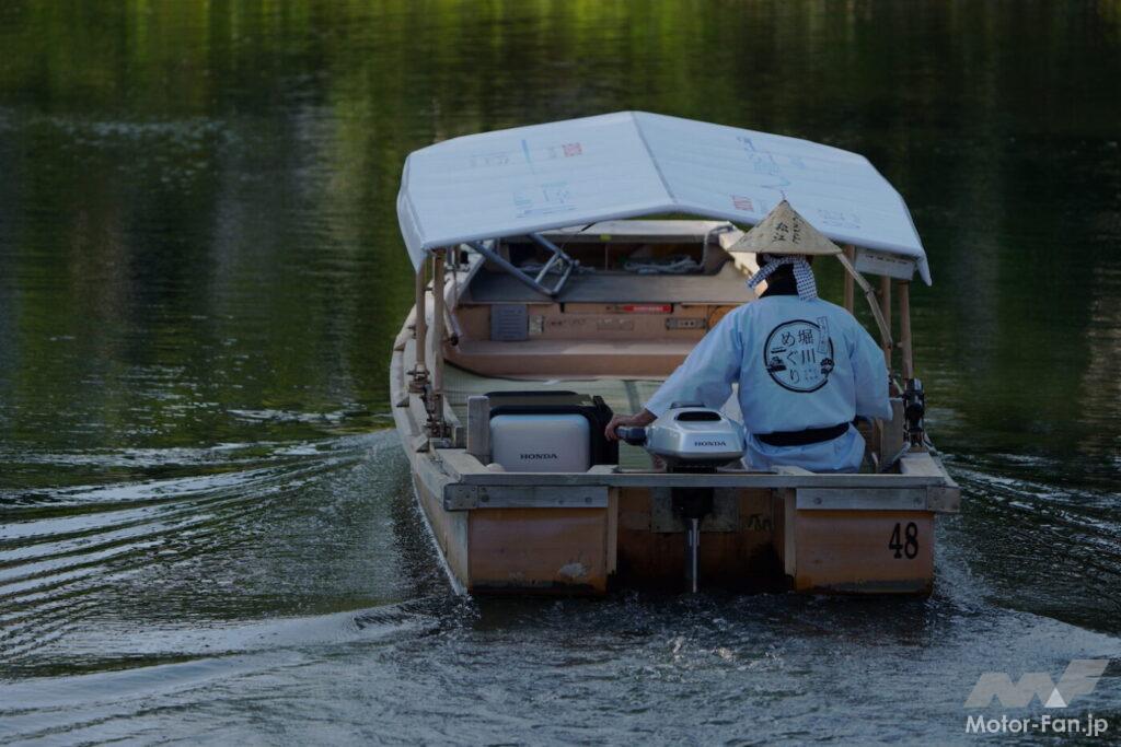 現在、堀川遊覧船には42艇の遊覧船があり、前述のホンダ製4スト船外機BF9.9を使っている。このうちの1艇(実際には3艇で、1艇はスペア、もう1艇はホンダが耐久試験を実施しているという)に4kW電動推進機のプロトタイプを付けて実証実験を行なう。